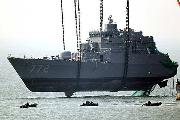 Η  ROKS Cheonan ανελκύεται από το βυθό, τα 2/3 του πλοίου, μετά το χτύπημα από σκάφος της Βόρειας Κορέας