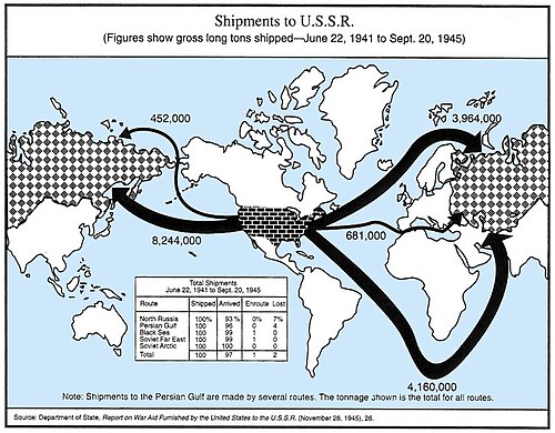 Όπως μας υπενθυμίζει άρθρο της ιστοσελίδας defence-point το 2022, οι ΗΠΑ παρέδωσαν στην ΕΣΣΔ 11.400 πολεμικά αεροσκάφη, 7.000 άρματα μάχης, 6.303 άλλα θωρακισμένα οχήματα, 427.284 φορτηγά οχήματα και τζιπ, 35.170 μοτοσυκλέτες, 2.328 οχήματα γενικής χρήσης και 2.670.371 τ. διυλισμένων πετρελαιοειδών, συμπεριλαμβανομένου του 58% του αεροπορικού καυσίμου που χρησιμοποίησε η Ερυθρά Αεροπορία (VVS)!