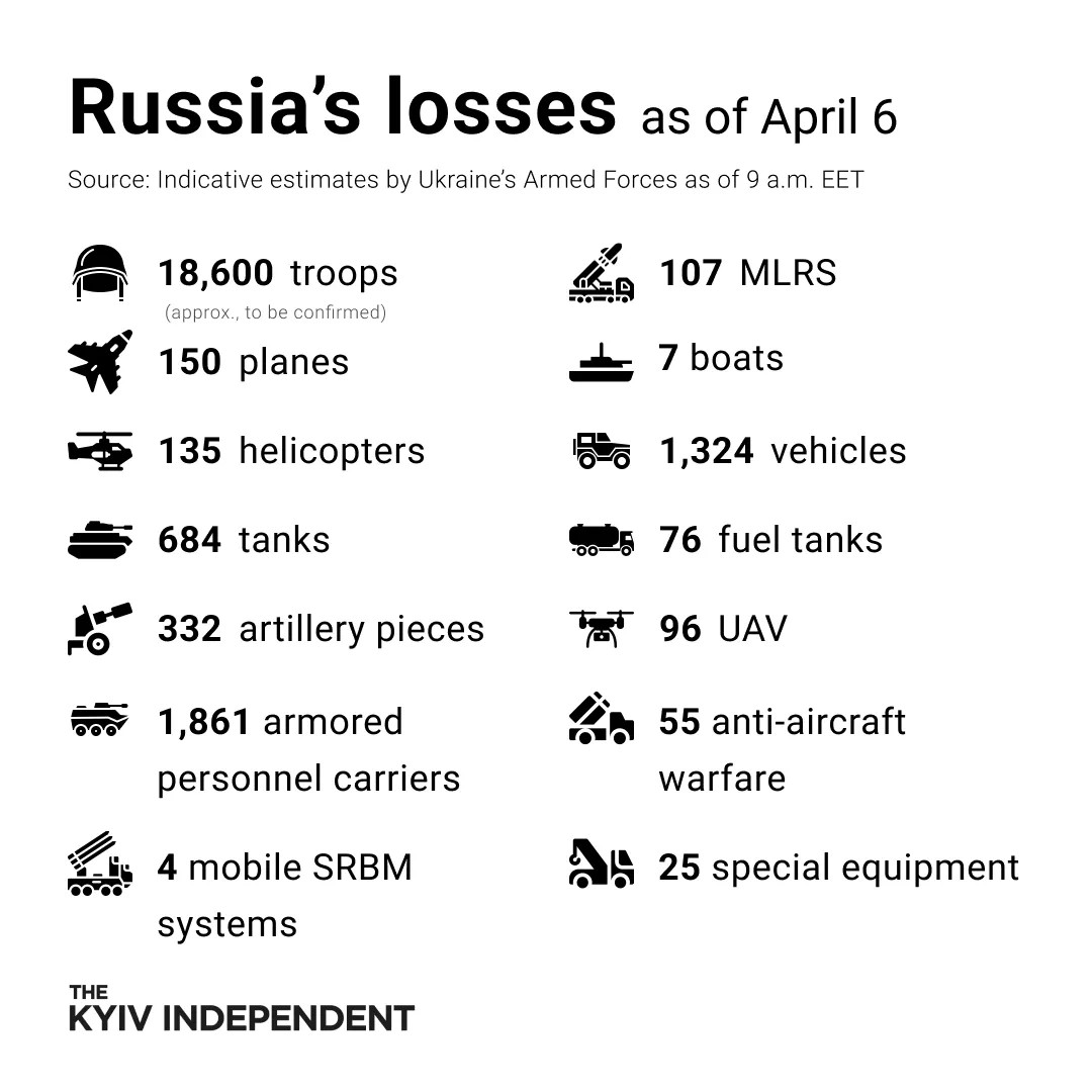 Από την Ουκρανική πλευρά βέβαια έχουμε ένα τελείως διαφορετικό ισολογισμό θανάτου. Ανατρέχοντας πάλι στην βασική πηγή, τον ιστότοπο του Kyiv Independent, που δημοσιοποιεί τακτικά την επίσημη ουκρανική εκτίμηση ρωσικών απωλειών, η τελευταία καταγραφή της 5ης Απριλίου μιλά για 18.600 νεκρούς! Δηλαδή υπερδεκαπλάσιους από τους 1.351 που έχουν ανακοινώσει οι Ρώσοι.