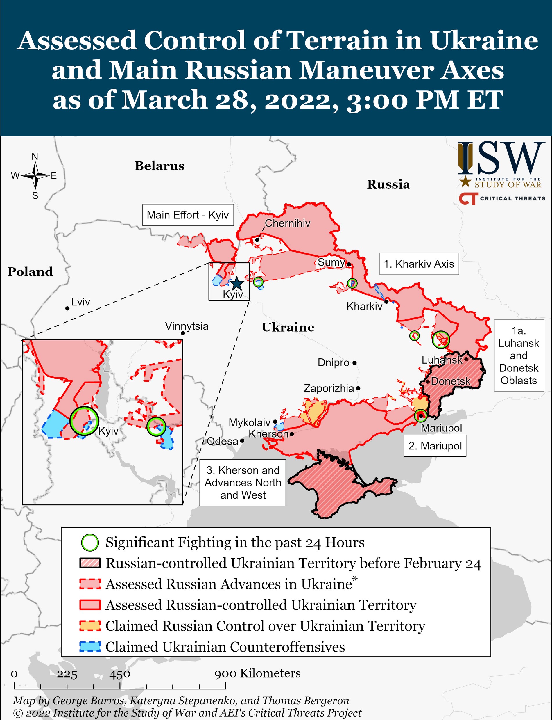 Ένα δεύτερο αξιοσημείωτο είναι πως παρά τις μεγάλες και αιματηρές μάχες ο εισβολέας Ρωσία δεν έχει ακόμη καταφέρει να καταλάβει μεγάλες πόλεις. Προς το παρόν έχει μπει στη Χερσώνα (290.000 κάτοικοι), στη Μαριούπολη (400.000), στη Μελιτόπολη (150.000) και το Μπερντιάνσκ (110.000) αλλά παραμένει να πολιορκεί το Χάρκοβο (1,4 εκατομμύρια), το Σούμι (260.000), το Τσερνίχιβ (280.000) και βέβαια το Κίεβο (2,9 εκατομμύρια), από όπου πλέον φαίνεται πως υποχωρεί λαμβάνοντας αμυντικές θέσεις στην περιφέρεια του.