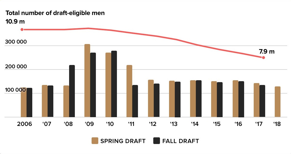 Η οκταετής πτώση που εμφανίζει η στρατολόγηση των ικανών προς στράτευση νέων ξεκίνησε μια το 2011, όταν το ρωσικό υπουργείο Άμυνας αποφάσισε να αυξήσει τον ποσοστό των επαγγελματιών στρατιωτών. Η στροφή των ρωσικών ενόπλων δυνάμεων από την τεράστια «δεξαμενή» κληρωτών προς έναν καλύτερα εκπαιδευμένο Στρατό έμπειρων επαγγελματιών, κρίθηκε απαραίτητη υπό το πρίσμα των σύγχρονων εξελίξεων και, κυρίως, εξαιτίας των ολοένα πιο εξελιγμένων οπλικών συστημάτων που εντάσσονται σε υπηρεσία.