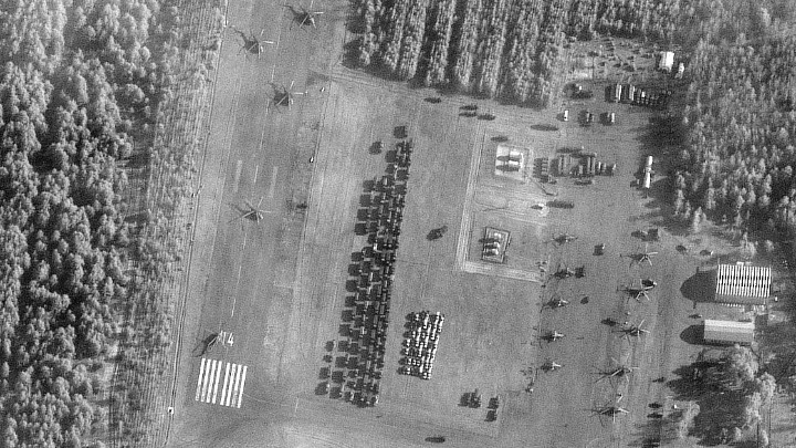 Σύμφωνα με την Maxar, στις δορυφορικές φωτογραφίες που τραβήχτηκαν την Παρασκευή διακρίνονται περισσότερα από 90 ελικόπτερα σταθμευμένα σε έναν δρόμο κοντά στην πόλη Χοϊνίκι της Λευκορωσίας, να σχηματίζουν μία «αλυσίδα» μήκους σχεδόν 8 χιλιομέτρων. Παράλληλα εμφανίζεται μία ισχυρή χερσαία δύναμη με εκατοντάδες οχήματα σε κοντινό σημείο.