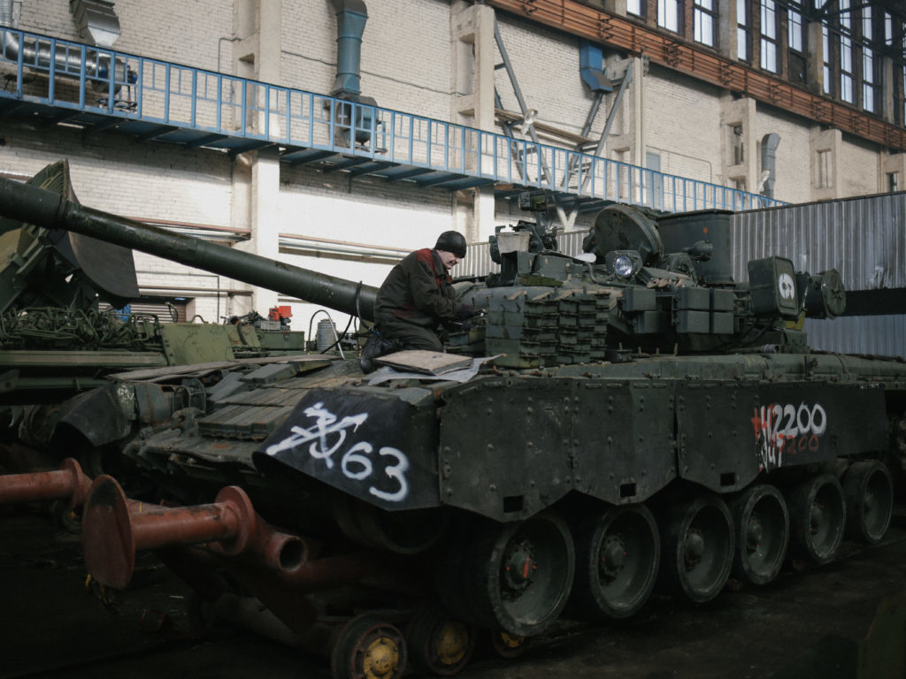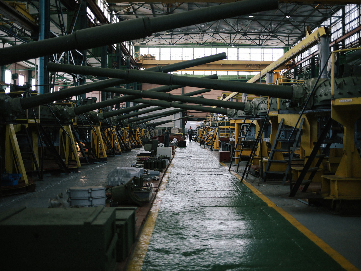 Τα δόντια του θηρίου: Μηχανικοί και εφαρμοστές ελέγχουν τον μηχανισμό βολής του λειόκαννου πυροβόλου 2A46-2 των 125 χιλ. το οποίο αφαιρείται από το τανκ για να βάλλει δοκιμαστικά με «άσφαιρα» –ναι, μέσα στο εργοστάσιο. Κανείς δεν απορεί γιατί τρέμουν τα παράθυρα και οι τοίχοι. Το έχουν συνηθίσει.