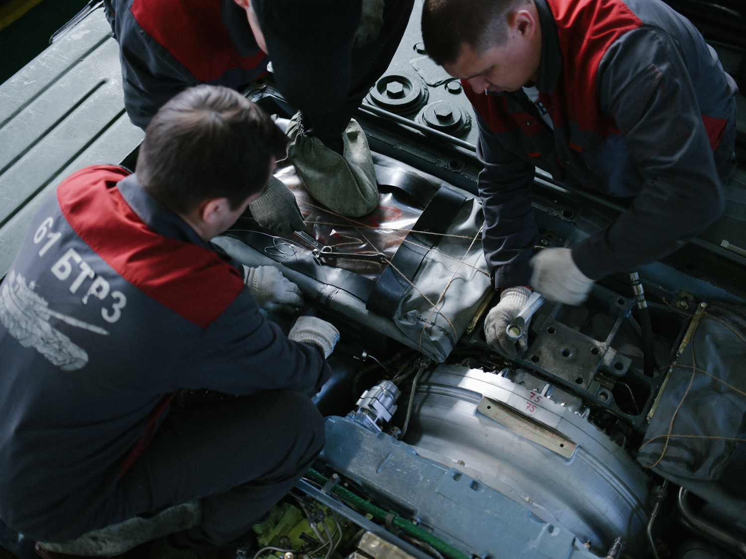 Κάθε άρμα «λύνεται» μπουλόνι-μπουλόνι. Για να αποσυναρμολογηθεί ένα Т-80БВ χρειάζεται πέντε άνδρες, έναν γερανό και έως τέσσερις ημέρες. Το άρμα ελέγχεται για σκουριά, επισκευάζεται αναλόγως και μετά έρχεται η σειρά των αρμολογητών, των «οπτικών» και των ηλεκτρολόγων. Όλοι ξέρουν την δουλειά αλλά οι παλαιότεροι ξέρουν τα άρματα του τύπου «απ’ έξω κι ανακατωτά».