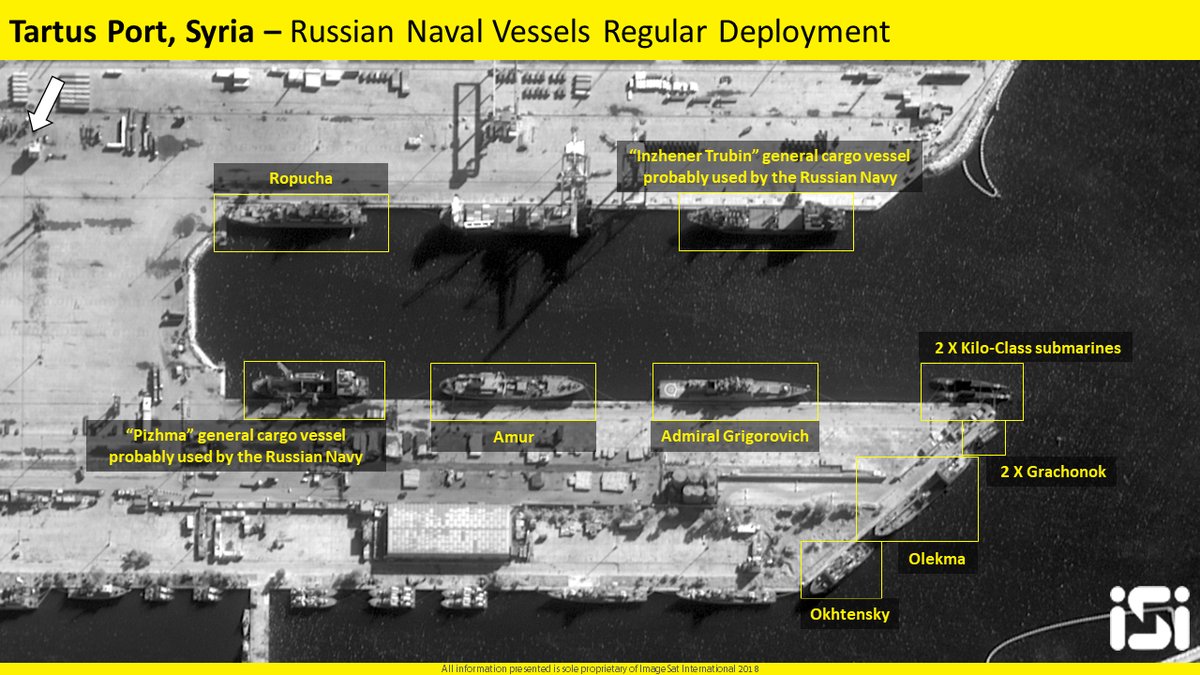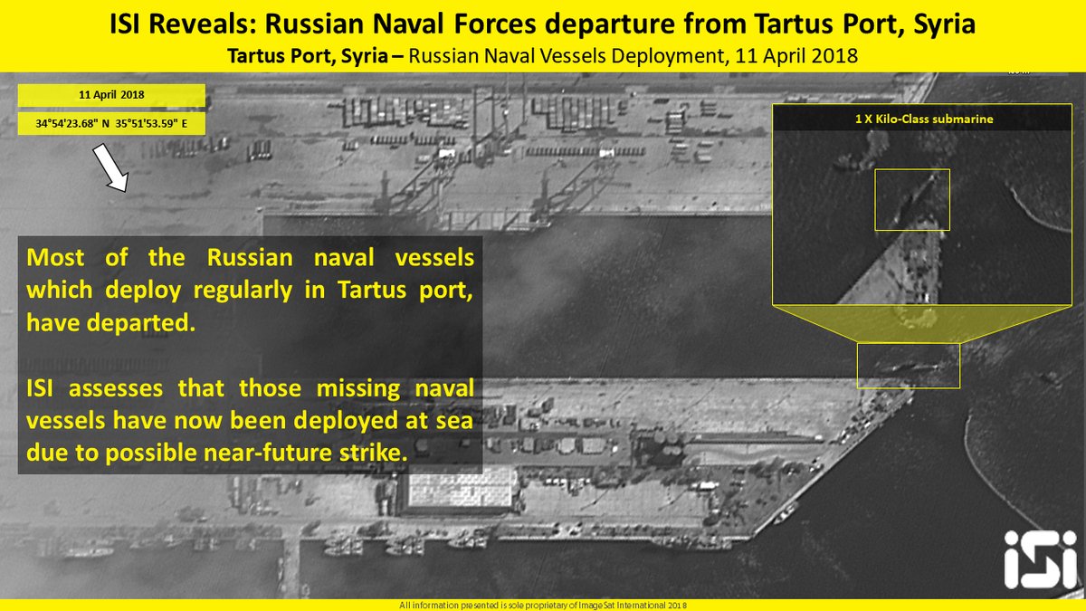 Τα ρωσικά πολεμικά πλοία που βρίσκονταν αγκυροβολημένα στην Ταρσό αναχώρησαν από το λιμάνι εν όψει ενδεχόμενου αμερικανικού πυραυλικού πλήγματος κατά της Συρίας, μεταδίδουν αρκετοί ειδησεογραφικοί και μη ιστότοποι. Η σύγκριση παλαιοτέρων και προσφάτων δορυφορικών φωτογραφιών φέρεται να επιβεβαιώνει την απομάκρυνση των ρωσικών πλοίων ενώ την ίδια ώρα το συριακό καθεστώς «αδειάζει» από αεροπλάνα τις αεροπορικές βάσεις Αλ Σην, Τ4, Χάμα και Ντουμαϊρ.