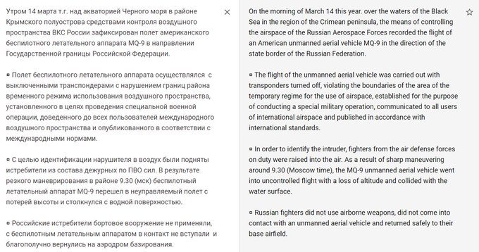 «Το πρωί της Τρίτης 14 Μαρτίου τρέχοντος έτους στη λεκάνη της Μ.Θάλασσας, στην περιοχή της χερσονήσου της Κριμαίας, από τα μέσα ελέγχου εναέριου χώρου των αεροδιαστημικών δυνάμεων της Ρωσίας καταγράφηκε η πτήση αμερικανικού μη επανδρωμένου αεροσκάφους τύπου MQ-9 με κατεύθυνση τα σύνορα της Ρωσικής Ομοσπονδίας», ανακοίνωσε το ρωσικό υπουργείο Άμυνας, σύμφωνα με το πρακτορείο ειδήσεων TASS.