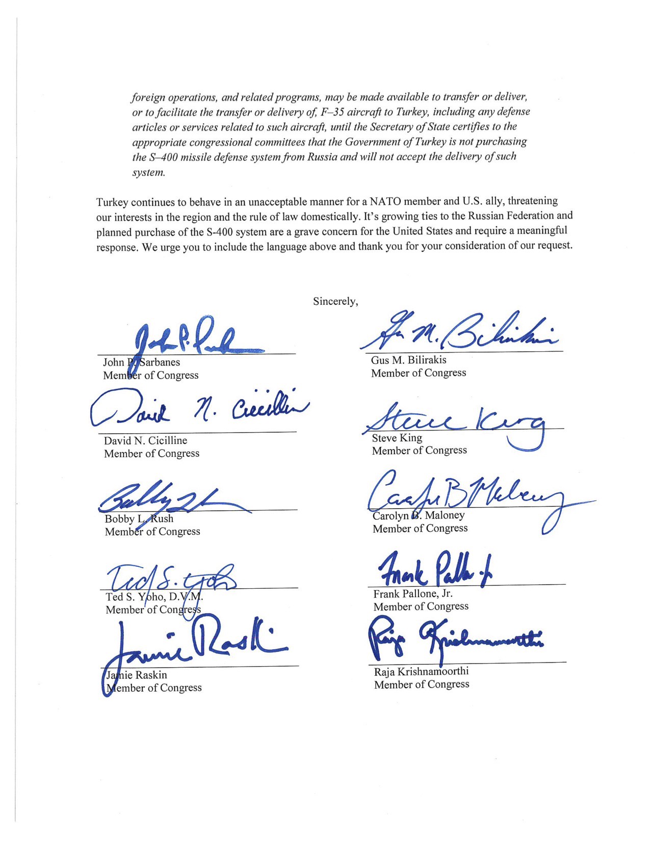 Οι επιστολή των Μπιλιράκη και Σαρμπάνη υπογράφεται από 31 ακόμη βουλευτές και επισημαίνει τους κινδύνους από την ταυτόχρονη απόκτηση S-400 και F-35 από την Τουρκία. Ζητά να μην διατεθούν πόροι για την μεταφορά των F-35 μέχρι το Στέιτ Ντιπάρτμεντ να βεβαιώσει το Κογκρέσο πως η Τουρκία δεν πρόκειται να αποκτήσει τους S-400.