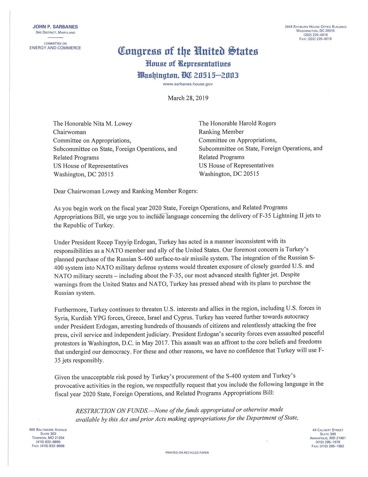 Οι Ελληνοαμερικανοί βουλευτές Γκας (Κώστας) Μπιλιράκης και Τζον Σαρμπάνης συνέταξαν επιστολή προς την πρόεδρο της Επιτροπής Προϋπολογισμού της Βουλής των Αντιπροσώπων, Nita Lowey ζητώντας να μην συμπεριληφθούν πόροι για τη μεταφορά των F-35 στη Τουρκία στον προϋπολογισμό του οικονομικού έτους 2020.