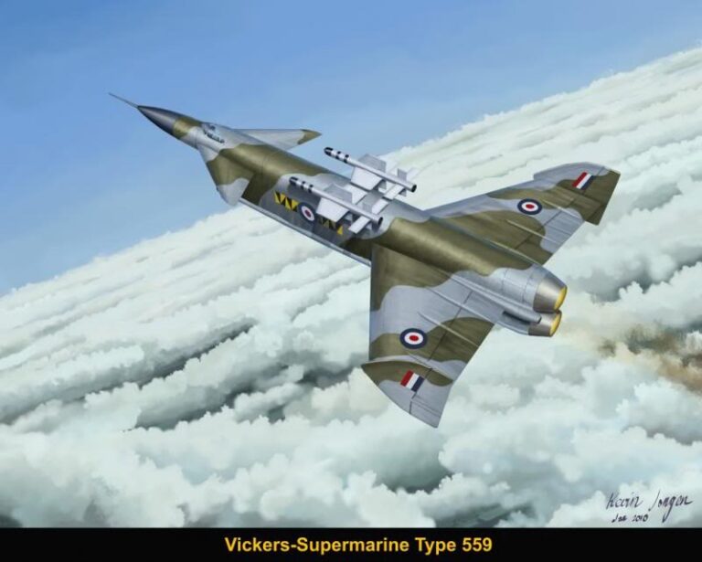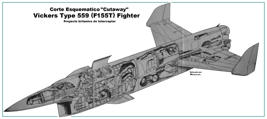 Η Vickers-Armstrongs με το σχεδιαστικό γραφείο αεροναυπηγικής της, τη Supermarine -που απέδωσε το θρύλο του Spitfire- παρουσίασε το ιδιαίτερα ριζοσπαστικό σχέδιο Type 559: με μεγάλα πτερύγια Canard κοντά στο ρύγχος, ευρύχωρη εισαγωγή αέρος στο κάτω μέρος της ατράκτου που τροφοδοτούσε δύο κινητήρες de Havilland Gyron, ώσης 27 χιλιάδων λιβρών με μετάκαυση, ο ένας πάνω από τον άλλο (σχέδιο που θα ξαναβλέπαμε λίγα χρόνια αργότερα στο μαχητικό English Electric Lightning), και μικρού εκπετάσματος πτέρυγες τύπου Δέλτα με πτερύγια διεύθυνσης στο άκρο τους και χωρίς ουραίο σταθερό! Επιπλέον αυτών, το σχέδιο προέβλεπε και δύο πυραυλοπροωθητές de Havilland Spectre, των 5.000 λιβρών ώσης, εκατέρωθεν της ατράκτου.