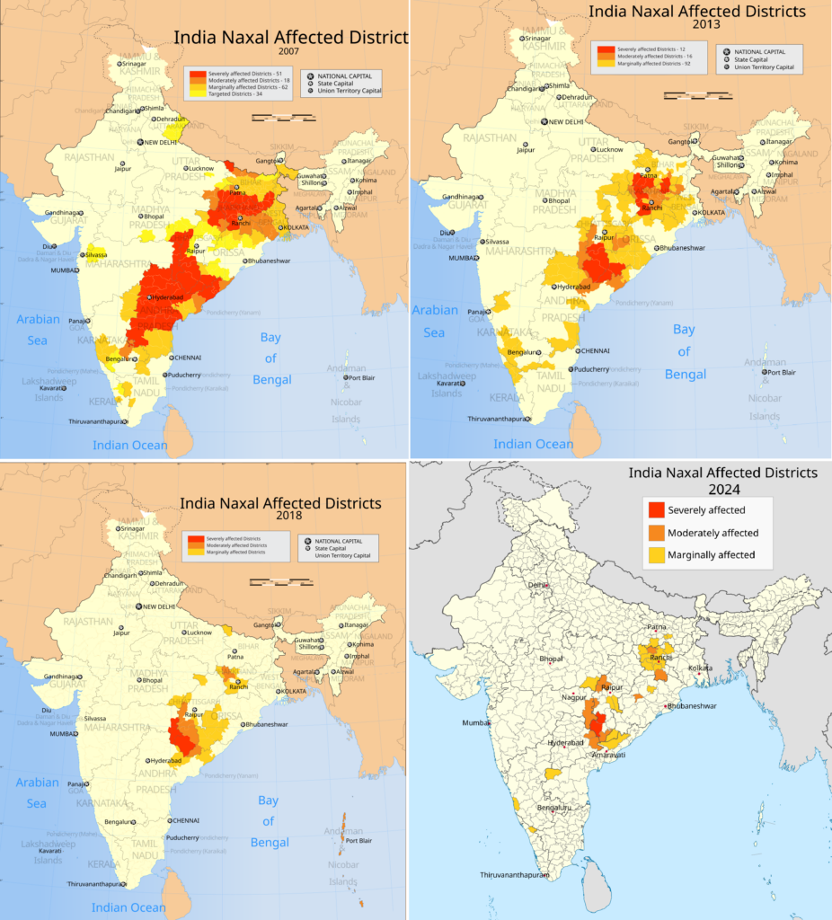 Η κορύφωση του κινήματος σημειώθηκε στις αρχές της δεκαετίας του 2000, όταν υπολογιζόταν ότι διέθετε 15.000–20.000 ένοπλους μαχητές, υποστηριζόμενους από επιπλέον 30 με 50 χιλιάδες μέλη σε βοηθητικούς ρόλους. Με την πάροδο του χρόνου εξελίχθηκε σε μία από τις σοβαρότερες εσωτερικές απειλές για την ασφάλεια της χώρας, με ισχυρή παρουσία στον λεγόμενο «Κόκκινο Διάδρομο», που εκτεινόταν σε πολλές πολιτείες της ανατολικής και κεντρικής Ινδίας.