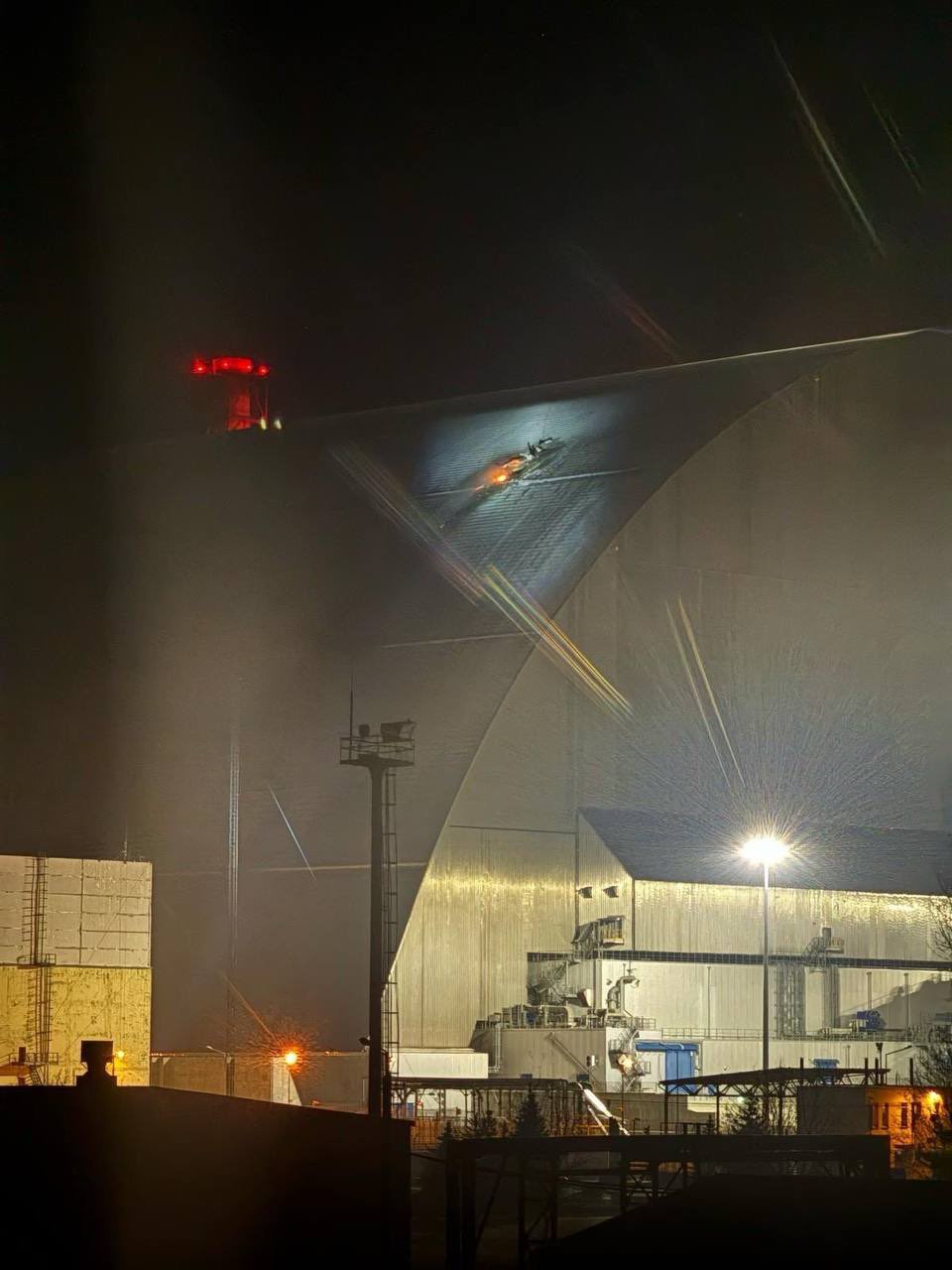 Αυτό καταγγέλεται από την Ουκρανία, με φωτογραφίες που δημοσιοποιήσαν να δείχνουν το σημείο της πτώσης πάνω στη τσιμεντένια σαρκοφάγο (η οποία υπέστη μικρές ζημιές), όπως και συντρίμια του drone. Επίσης ξέσπασε μικρής έκτασης φωτιά η οποία κατασβέστηκε. Όπως αναφέρει η Διεθνής Επιτροπή Ατομικής Ενέργειας, δεν καταγράφηκε άνοδος του επιπέδου ραδιενέργειας στην περιοχή.