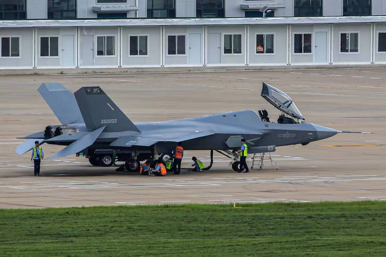 Η φωτογραφία (χωρίς εμφανή σημάδια «επεμβάσεων» αλλά χωρίς να μπορούν να αποκλειστούν), απεικονίζει το αεροσκάφος «350003», που σύμφωνα με την κινεζική πρακτική απόδοσης αριθμών αναγνώρισης ίσως αφορά στο τρίτο πρωτότυπο του J-35 (όπως πλέον και επίσημα επιβεβαιώνεται ο προσδιορισμός του ναυτικού μαχητικού).
