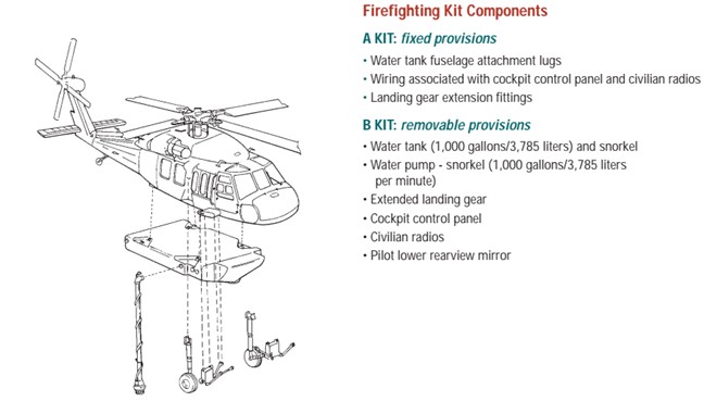 Σε ότι αφορά το FireHawk, το πρώτο αναπτύχθηκε το 1998 για την Πυροσβεστική υπηρεσία του Λος ‘Aντζελες. Χρησιμοποιήθηκε ένα Black Hawk UH-60 του Αμερικανικού Στρατού και πιιστοποιήθηκε η επιμήκυνση των σκελών προσγείωσης και τα ειδικά σημεία ανάρτησης εξωτερικής δεξαμενής. Ακόμη προσαρμόσθηκε και πιστοποιήθηκε εξωτερική δεξαμενή με αναρροφητήρα και τοποθετήθηκε ειδικό σύστημα πυρόσβεσης με μείκτη νερού-επιβραδυντικού (με καλωδιώσεις εντολών μείξεως, λειτουργίες αναρρόφησης και ελεγχόμενης ρίψης) ενώ βέβαια πιστοποιήθηκε η αεροπλοϊμότητα του συνόλου.