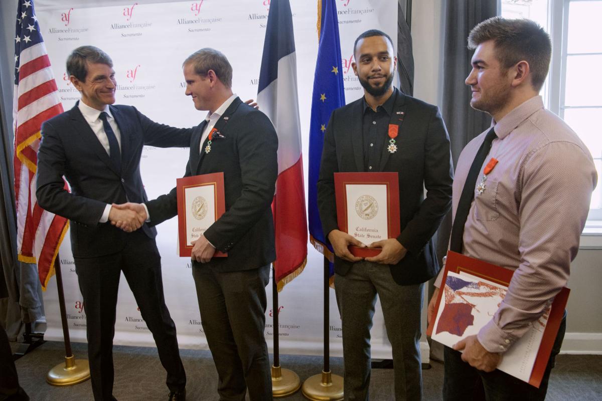 Η εκδήλωση έγινε στις 31 Ιανουαρίου 2019 στο γενικό προξενείο της Γαλλίας στο Σακραμέντο από τον Γάλλο πρόξενο Εμμάνουελ Λεμπρίν-Νταμιάν, επισημαίνει η γαλλική έκδοση της “Huffighton Post”. Αν και βρίσκονταν σε διακοπές, οι τρεις άνδρες δεν δίστασαν στις 21 Αυγούστου 2015 να εξουδετερώσουν ένοπλο Μαροκινό τζιχαντιστή σε τραίνο από το Άμστερνταμ για το Παρίσι, εξοπλισμένο με τυφέκιο μάχης AKM, πιστόλι Luger και μαχαίρι, που απειλούσε να βλάψει τους επιβάτες. Στο τραίνο επέβαιναν 554 άτομα, ενώ κατά τη διαδικασία αφοπλισμού του τρομοκράτη τραυματίστηκε ο Στόουν.