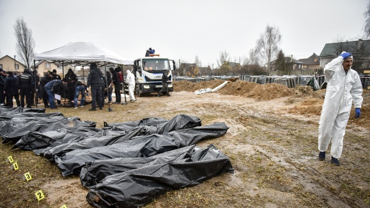 «Η Ουκρανία είναι μια σκηνή εγκλήματος. Είμαστε εδώ επειδή μπορούμε εύλογα να υποθέσουμε ότι διαπράττονται εγκλήματα που εμπίπτουν στη δικαιοδοσία του Δικαστηρίου. Οφείλουμε να διαπεράσουμε την ομίχλη του πολέμου για να φθάσουμε στην αλήθεια», δήλωσε ο εισαγγελέας στη διάρκεια επίσκεψής του σ’ αυτή την πόλη, όπου εκατοντάδες άμαχοι, σύμφωνα με τις ουκρανικές αρχές, βρέθηκαν νεκροί μετά την αποχώρηση των Ρώσων που την είχαν καταλάβει.