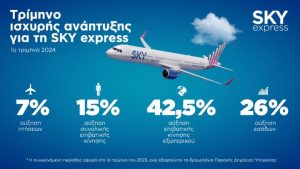 Ισχυρή ανάπτυξη το πρώτο τρίμηνο του έτους, καταγράφοντας συνολική αύξηση επιβατικής κίνησης 15% σε σχέση με το αντίστοιχο τρίμηνο του 2023 σημείωσε η SKY express.