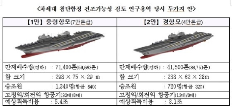 Δυο προτάσεις παρουσιάστηκαν για την απαίτηση του νοτιοκορεάτικου Ναυτικού για την προμήθεια ενός νέου αεροπλανοφόρου από το 2033, μία για ένα αεροπλανοφόρο μεσαίου μεγέθους 70.000 τόνων κι ένα ελαφρύ 40.000 τόνων.