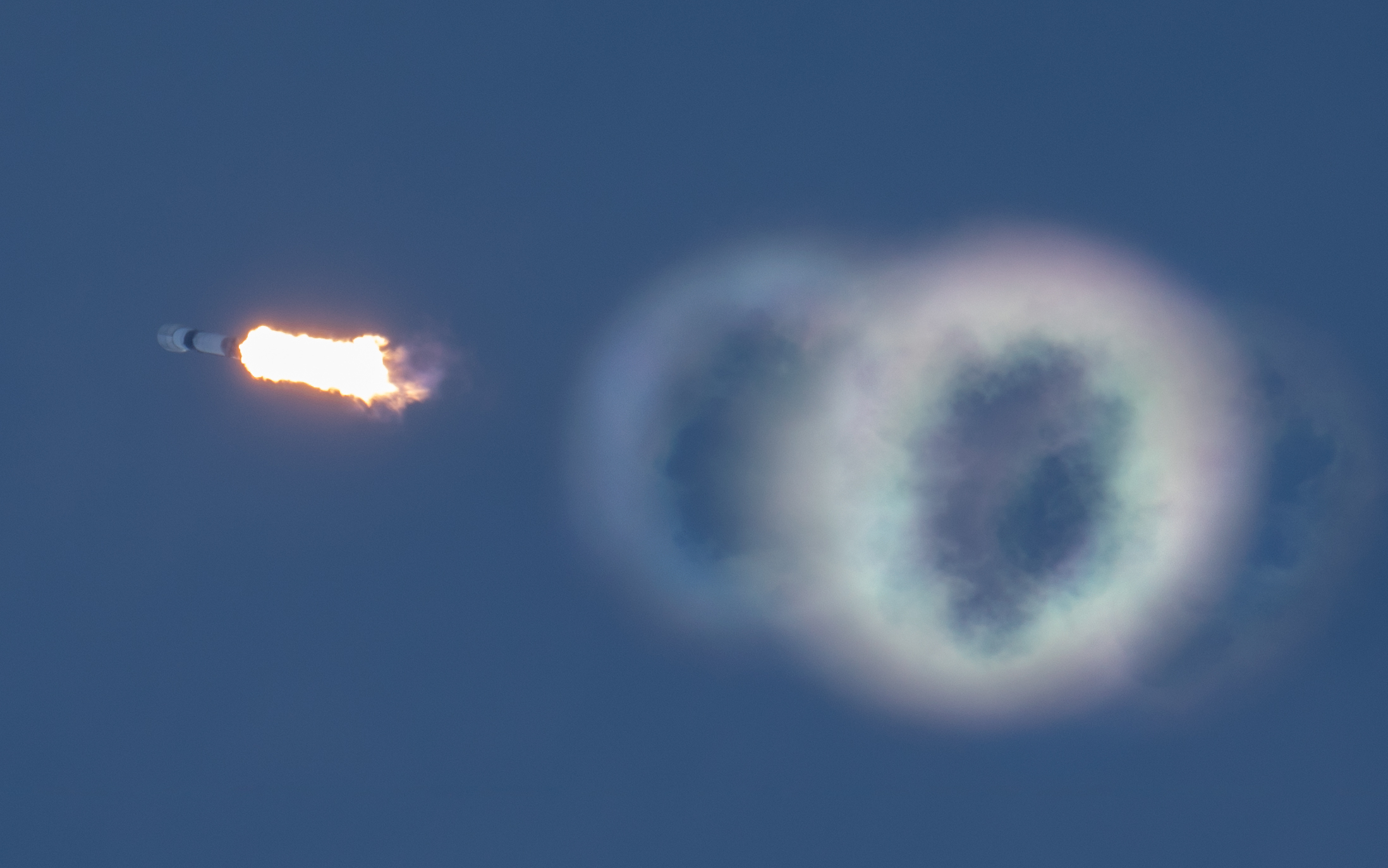 Στη δεύτερη φωτογραφία διακρίνεται η ευθυγράμμιση του φορέα κατά την βορειοδυτική πορεία, συνηθισμένη επιλογή για τοποθέτηση δορυφόρων Starlink σε συγκεκριμένες τροχιές. Η τρίτη εικόνα καταγράφει το εντυπωσιακό vapor ring από ατμοσφαιρική συμπύκνωση, φαινόμενο που εμφανίζεται στη μετάβαση μεταξύ πυκνών και αραιών στρωμάτων, λίγο πριν την ολοκλήρωση της φάσης του πρώτου σταδίου.