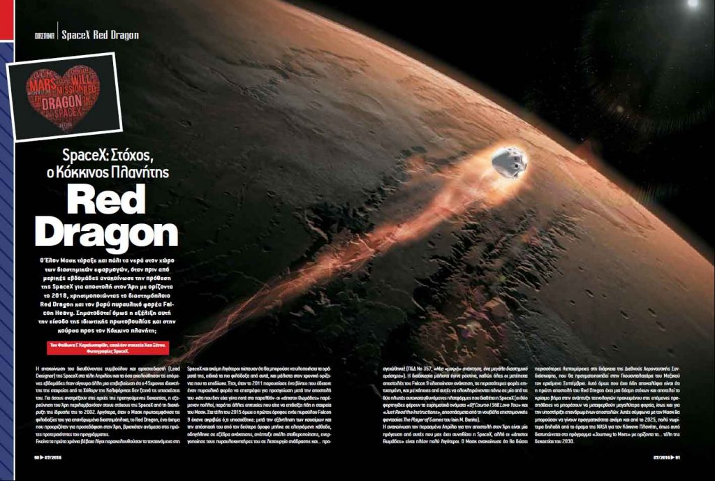 Ο Έλον Μασκ τάραξε και πάλι τα νερά στον χώρο των διαστημικών εφαρμογών, όταν πριν από μερικές εβδομάδες ανακοίνωσε την πρόθεση της SpaceX για αποστολή στον Άρη με ορίζοντα το 2018, χρησιμοποιώντας το διαστημόπλοιο Red Dragon και τον βαρύ πυραυλικό φορέα Falcon Heavy. Σηματοδοτεί όμως η εξέλιξη αυτή την είσοδο της ιδιωτικής πρωτοβουλίας και στην κούρσα προς τον Κόκκινο πλανήτη;