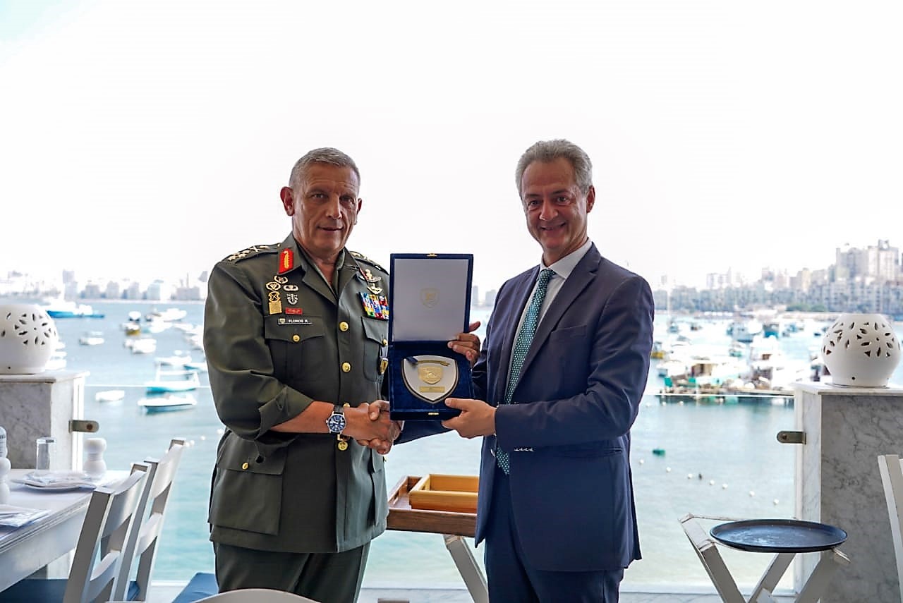Τέλος, συναντήθηκε στην Πρεσβευτική Κατοικία με τον Πρέσβη της Ελλάδος στην Αίγυπτο κ. Νικόλαο Γαριλίδη, με τον οποίο σε ιδιαίτερα θερμό κλίμα συζήτησαν για τις τρέχουσες εξελίξεις στην Ανατολική Μεσόγειο, στα Βαλκάνια, στη Μέση Ανατολή και στην Βόρεια Αφρική, για την διαρκή εμβάθυνση των σχέσεων και της Στρατιωτικής Συνεργασίας των 2 Χωρών, καθώς και για τα πολυμερή σχήματα συνεργασίας στα οποία συμμετέχουμε από κοινού και τον ρόλο τους για την ασφάλεια και την σταθερότητα της ευρύτερης περιοχής.