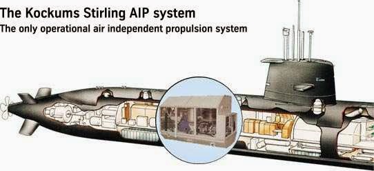 Το σουηδικό σύστημα Stirling AIP είναι τεχνολογικά απλούστερο, ενεργειακά λιγότερο αποδοτικό, αλλά εφοδιαστικά πιο ανθεκτικό. Πρόκειται για θερμικό κινητήρα κλειστού κύκλου τύπου Stirling, όπου ένα αδρανές αέριο – κυρίως ήλιο – θερμαίνεται από εξωτερική καύση ντίζελ με υγρό οξυγόνο σε θερμοκρασίες 600 έως 750°C, αυξάνοντας την πίεση του αερίου έως και 200 bar. Η διαστολή και συστολή του αερίου κινεί έμβολα, τα οποία μετατρέπουν τη θερμική ενέργεια σε μηχανικό έργο και στη συνέχεια σε ηλεκτρική ισχύ.