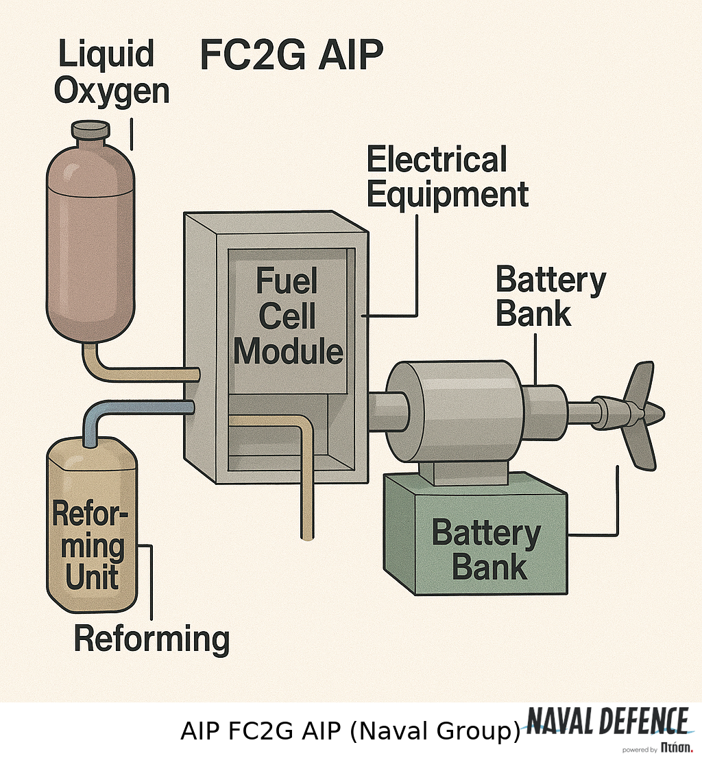 Αντιλαμβανόμενη τις επιχειρησιακές αδυναμίες, η Naval Group παρουσίασε το νέο σύστημα, FC2G (Fuel Cell Second Generation) το 2017. Αυτό υπόσχεται ηλεκτροχημική λειτουργία χωρίς ανάγκη αποθήκευσης υδρογόνου, χρησιμοποιώντας αναμορφωτή ντίζελ που παράγει υδρογόνο και διοξείδιο του άνθρακα. Θεωρητικά, η τεχνολογία αυτή εξαλείφει την ανάγκη για ακριβές εγκαταστάσεις υδρογόνου στην ξηρά. Στην πράξη, όμως, η διαδικασία reforming απαιτεί θερμοκρασίες 700 έως 850°C, ακριβείς καταλύτες, συστήματα ψύξης, συμπιεστές CO₂, αυτοματισμούς ασφαλείας και υπομονάδες καθαρισμού υδρογόνου. Η παραγόμενη καθαρότητα υδρογόνου κυμαίνεται στο 95 έως 97%, μειώνοντας την ηλεκτροχημική απόδοση των γαλλικών PEM φθάνει το 40-45%, χαμηλότερα από τα 60% των γερμανικών.