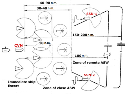 Σχήμα 1: Τυπικός κινούμενος σχηματισμός δύναμης κρούσης αεροπλανοφόρου του αμερικανικού ναυτικού, όπου φαίνεται ανεπτυγμένη η ανθυποβρυχιακή άμυνα σε βάθος. Τα παλαιότερης γενιάς σοβιετικά SSGN, προκειμένου να προσβάλλουν το αεροπλανοφόρο (CVN), θα έπρεπε να βρεθούν στην περιοχή μεταξύ της εγγύς και της μακράς ζώνης ανθυποβρυχιακής προστασίας (close & remote ASW zones), αφού δηλαδή θα είχαν προηγουμένως καταφέρει να προσπεράσουν χωρίς να εντοπισθούν τις περιπολίες των ανθυποβρυχιακών αεροσκαφών S-3 Viking και P-3C Orion, ενώ ακολουθούν τα ανθυποβρυχιακά ελικόπτερα SH-3 Sea King. Σχεδόν αμέσως μετά την επίθεση με τα κατευθυνόμενα βλήματα P-120 Malakhit (εμβέλειας 120 km), ουσιαστικά το SSGN προδίδει τη θέση του (flaming datum),[vi] τόσο οπτικά όσο και μέσω ανίχνευσης των βλημάτων από τα εναέρια ραντάρ των αεροσκαφών έγκαιρης προειδοποίησης E-2 Hawkeye, ενεργοποιώντας έτσι αλυσιδωτά τις αντιδράσεις της αεράμυνας της δύναμης (μαχητικά αεροσκάφη και κατευθυνόμενα βλήματα). Από την απόσταση των 120 km, τα υποηχητικά P-120 Malakhit χρειάζονται περίπου 7 λεπτά να καταφθάσουν στο στόχο τους, χρόνος που θεωρείται αρκετός για να αντιμετωπιστούν αποτελεσματικά. Ταυτόχρονα, τα ανθυποβρυχιακά ελικόπτερα SH-3 Sea King, με ταχύτητα 140 knots, μπορούν να καταφθάσουν στη θέση του υποβρυχίου (flaming datum) σε 5-20 λεπτά. Όμως, τα νεότερα SSGN είναι εξοπλισμένα με τα υπερηχητικά βλήματα Oniks (εμβέλειας 800 km) και τα υπερ-υπερηχητικά Zircon (εμβέλειας >1000 km), για τα οποία οι διατιθέμενοι χρόνοι αντίδρασης από την απόσταση των 800 km, είναι περίπου 19-20 λεπτά και 4 λεπτά, αντίστοιχα.