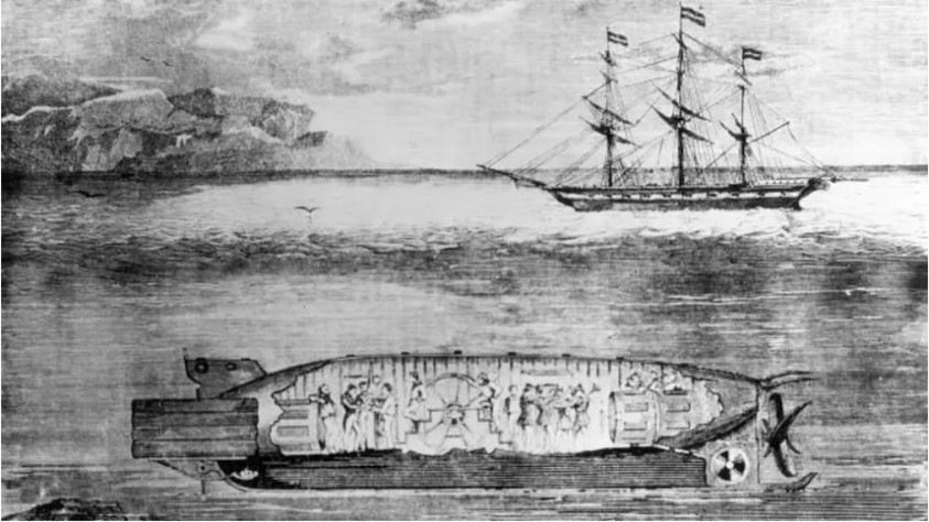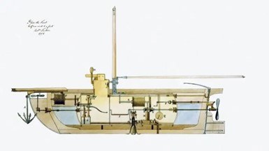 Σχήμα 9: Ο Βαυαρός εφευρέτης Wilhelm Bauer κατασκεύασε το πρώτο του υποβρύχιο όχημα (Brandtaucher – Iron seal), το 1850. Σε κάποια επίδειξη βυθίστηκε και ο εφευρέτης γλύτωσε τη ζωή του τελευταία στιγμή. Συνεχίζοντας τους πειραματισμούς και αφού έλαβε χρηματοδότηση από τη ρωσική κυβέρνηση, το 1855, κατασκεύασε στην Αγία Πετρούπολη το Sea Devil, ένα υποβρύχιο όχημα 16 m, με δυνατότητα μεταφοράς 12 ατόμων. Το σκάφος διέθετε καινοτομίες όπως πολλαπλές δεξαμενές άνωσης, αεροφυλάκιο και προπέλα κινούμενη με πετάλια από το πλήρωμα. Το Sea Devil, μετά από περισσότερες από 130 επιτυχείς καταδύσεις, τελικά χάθηκε στη θάλασσα. Στην εικόνα πάνω φαίνεται μια μπάντα πνευστών, με την οποία το Sea Devil καταδύθηκε παίζοντας το ρωσικό εθνικό ύμνο την ημέρα στέψης του τσάρου Αλεξάνδρου Β΄. Σήμερα, υπάρχει έκθεμα του Brandtaucher, στο πολεμικό μουσείο της Δρέσδης.