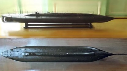 Σχήμα/εικόνα 10: Το πρωτόγονο 12 m επιθετικό υποβρύχιο CSS H.L. Hunley σχεδιάστηκε για να διασπάσει τους ναυτικούς αποκλεισμούς των Βορείων, κατά τον αμερικανικό εμφύλιο πόλεμο. Κατασκευάστηκε το 1863, στο Mobile της Alabama, από ανακυκλωμένους ατμολέβητες. Διέθετε χώρο για 9 άτομα (έναν πηδαλιούχο και 8 για τη χειροκίνητη περιστροφή της προπέλας). Στην πλώρη έφερε επακόντιο τορπίλη. Κατά τη διάρκεια των δοκιμών βυθίστηκε δύο φορές, παρασύροντας στο θάνατο συνολικά 13 άτομα, μαζί με τον ναυπηγό του Horace Lawson Hunley. Στις 17 Φεβρουαρίου 1864, ο υποπλοίαρχος George Dixon με πλήρωμα εθελοντών κατάφερε να πλεύσει στο λιμάνι του Charleston και σε μια επίθεση αυτοκτονίας να βυθίσει το πολεμικό πλοίο (sloop-of-war) των βορείων USS Housatonic.