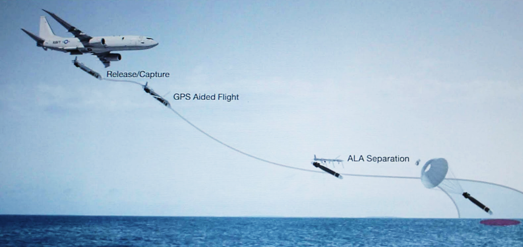 Σχήμα 3: Το αμερικανικό ναυτικό έχει αναθέσει στην Boeing, την εξέλιξη συλλογής (kit) που επιτρέπει την άφεση τορπιλών Mk-54 από ύψος έως και 30.000 ft, για την προσβολή υποβρυχίων. Το σχετικό πρόγραμμα HAAWC (High Altitude Anti-Submarine Warfare Weapon Capability) Air Launch Accessory (ALA) προορίζεται να αξιοποιήσει τις επιδόσεις του αεροσκάφους P-8, χρησιμοποιώντας τα πτερύγια ανεμοπορίας της βόμβας SDB (Small Diameter Bomb) και την ουρά με το GPS σύστημα καθοδήγησης της βόμβας JDAM (Joint Direct-Attack Munition).