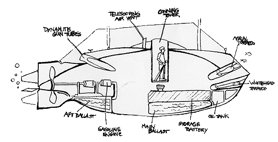 Σχήμα 8: Το 1798-1800, ο Αμερικανός μηχανικός Robert Fulton, ο εφευρέτης του πρώτου αξιόπιστου ατμόπλοιου, σχεδίασε για τη Γαλλική κυβέρνηση το 6.5 m υποβρύχιο μεταλλικό σκάφος Nautilus. To σκάφος, σε κατάδυση, χρησιμοποιούσε χειροκίνητη προπέλα 4 πτερυγίων, ενώ σε ανάδυση έφερε πτυσσόμενο ιστό με πανί. Για το πλήρωμα σε κατάδυση υπήρχαν φιάλες συμπιεσμένου αέρα, αλλά το σκάφος ποτέ δεν πέρασε το στάδιο των δοκιμών.