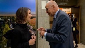 Αναφερόμενος στην επικείμενη συνάντηση με την κυρία Μπέρμποκ, ο υπουργός Εξωτερικών σημείωσε ότι θα ενημερώσει την ομόλογό του για την πρόσφατη επίσκεψή του στην Ουκρανία, για την κατάσταση στην Ανατολική Μεσόγειο, ενώ θα τεθούν και θέματα διμερούς ενδιαφέροντος.