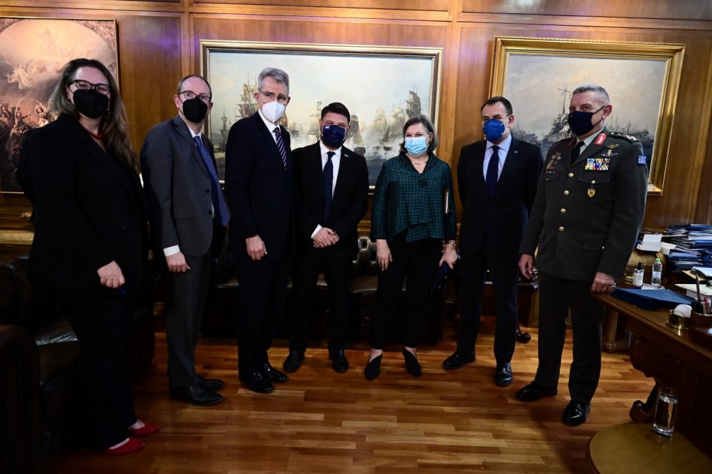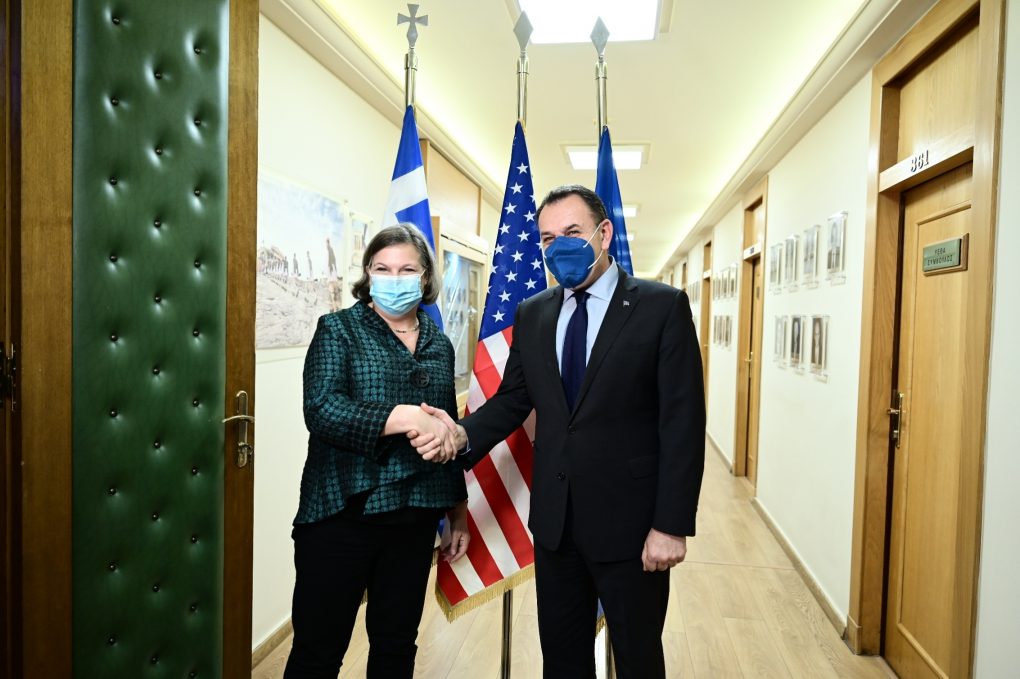 O υπουργός Εθνικής Άμυνας Νικόλαος Παναγιωτόπουλος συναντήθηκε σήμερα, Τρίτη 5 Απριλίου 2022, παρουσία του υφυπουργού Εθνικής Άμυνας, Νικόλαου Χαρδαλιά, του αρχηγού ΓΕΕΘΑ, στρατηγού Κωνσταντίνου Φλώρου και του πρέσβη των ΗΠΑ, Τζέφρι Πάιατ, με την υφυπουργό Εξωτερικών των ΗΠΑ, αρμόδια για Πολιτικές Υποθέσεις, πρέσβη, Βικτόρια Νούλαντ.