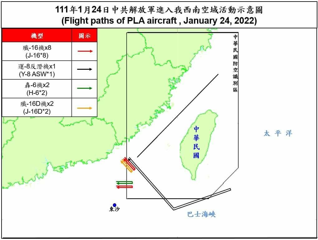 Το υπουργείο Αμύνης της Ταϊβάν, από την πλευρά του, ανακοίνωσε πως ένα ζευγάρι κινεζικά J-16D τεισήλθε στη ζώνη ADIZ στις 24 Ιανουαρίου με τη συνοδεία οκτώ μαχητικών πολλαπλού ρόλου J-16, ενός αεροσκάφους ανθυποβρυχιακού πολέμου Y-8 και δύο στρατηγικών βομβαρδιστικών H-6K.