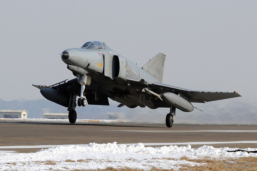 Northrop AN/ASX-1 TISEO στο χείλος προσβολής, πάνω από τον αριστερό έσω υποπτερύγιο φορέα, νοτιοκορεατικού F-4E όψιμης παραγωγής.