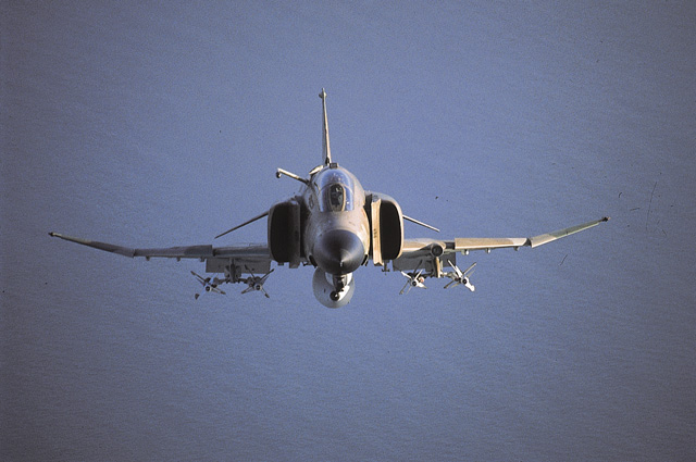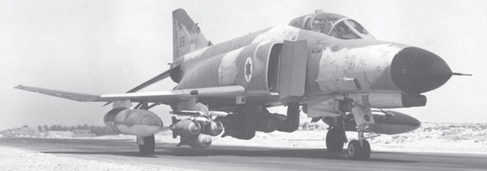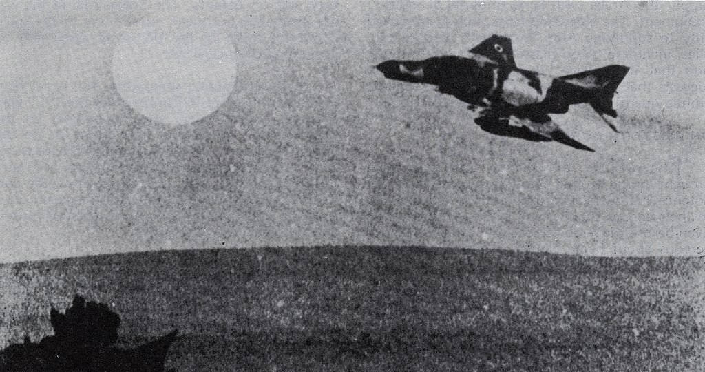 Τυπική φωτογραφία του πολέμου του Yom Kippur, ενδεικτική του χαμηλού ύψους στο οποίο πετούσαν τα κατάφορτα ισραηλινά Phantom σε αποστολές κρούσεως.