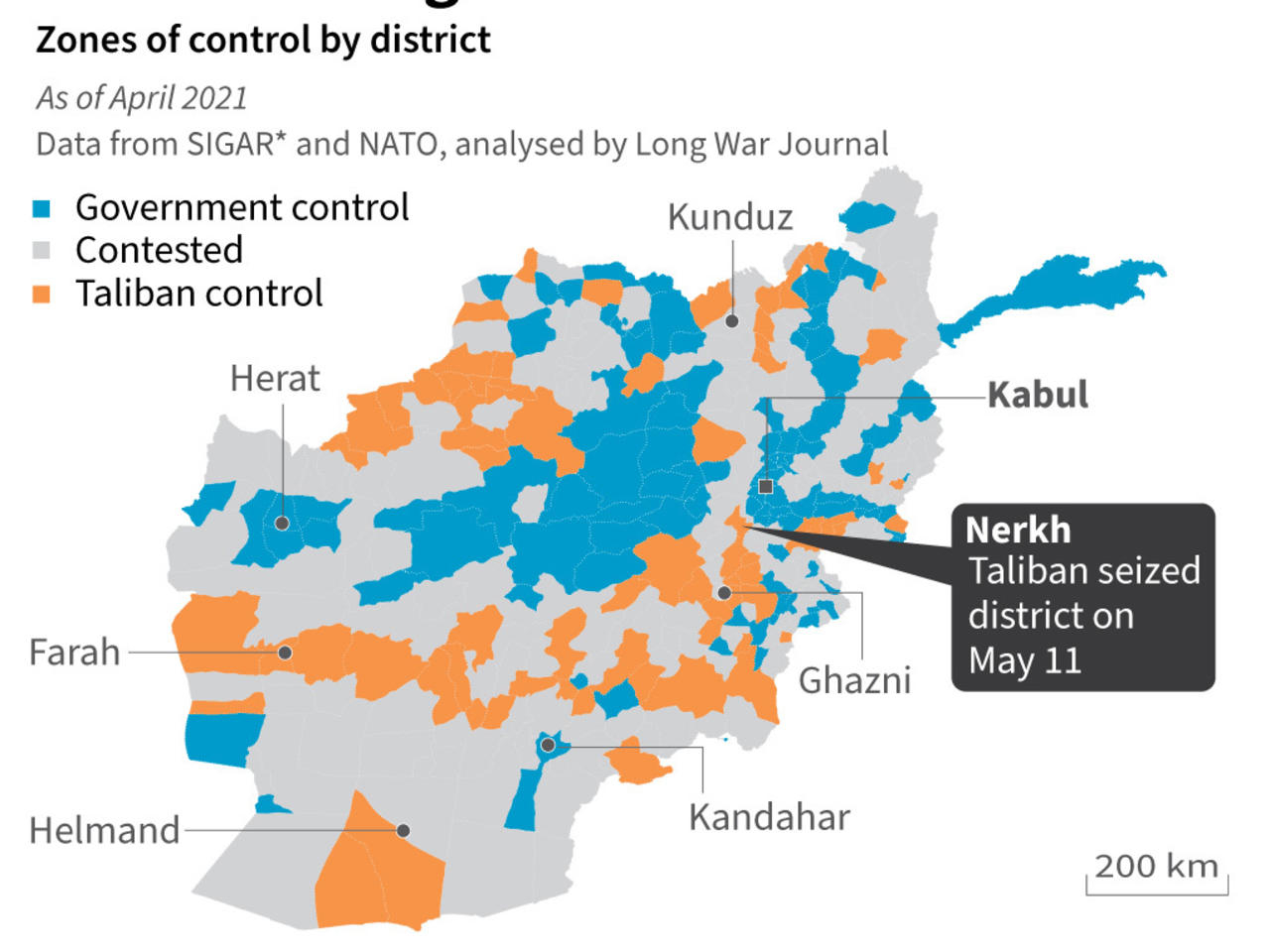 Έτσι σε αιφνιδιαστική επίθεση λίγες ώρες πριν την εκεχειρία, κατάφεραν να καταλάβουν (ή έστω να έχουν ισχυρή παρουσία καθώς στο αφγανικό τοπίο τα πάντα είναι ρευστά) την επαρχία Nerkh η οποία απέχει μόλις 40 χιλιόμετρα από την πρωτεύουσα της χώρας Καμπούλ. Όπως φαίνεται στο σχετικό χάρτη, όλη η χώρα είναι κατακερματισμένη με περιοχές στο κέντρο και στα βόρεια (με χρώμα μπλε) να ελέγχονται από την αφγανική κυβέρνηση, τους Ταλιμπάν να έχουν ισχυρή παρουσία και κυριαρχία στο νότο και στα βορειοδυτικά (ζώνες με πορτοκαλί χρώμα) ενώ πάνω από τη μισή έκταση του Αφγανιστάν να είναι διαφιλονικούμενη ζώνη με περιστασιακή επικράτηση της μίας ή της άλλης πλευράς.