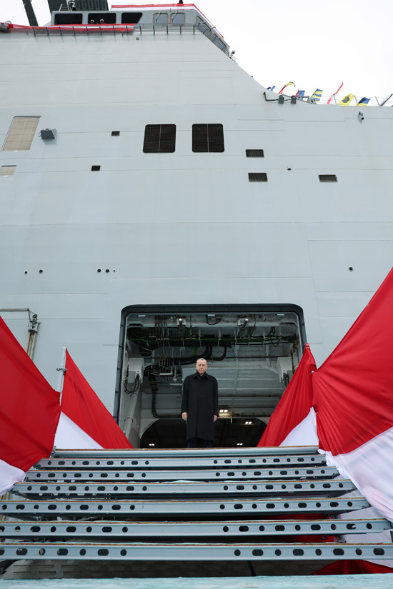 Ο Πρόεδρος Ερντογάν ήταν παρών βέβαια καθώς η τελετή ήταν μια ιδανική ευκαιρία προβολής ενόψει και των εθνικών εκλογών στη χώρα. Στην ομιλία του μάλιστα τόνισε πως με το Anadolu «έχουμε ένα σύμβολο ότι κατοχυρώνουμε την θέση μας ως περιφερειακή ηγέτιδα δύναμη». Ο ίδιος εξήρε την πρωτοτυπία του σκάφους καθώς θα είναι και το πρώτο παγκοσμίως από το οποίο θα απογειώνονται μη επανδρωμένα αεροσκάφη (όταν αυτό ολοκληρωθεί βέβαια) όπως και ελαφριά μαχητικά Hurjet. Επίσης περιέγραψε πως το Anadolu θα συνεισφέρει και σε ανθρωπιστικές αποστολές και σε αντιμετώπιση φυσικών καταστροφών.