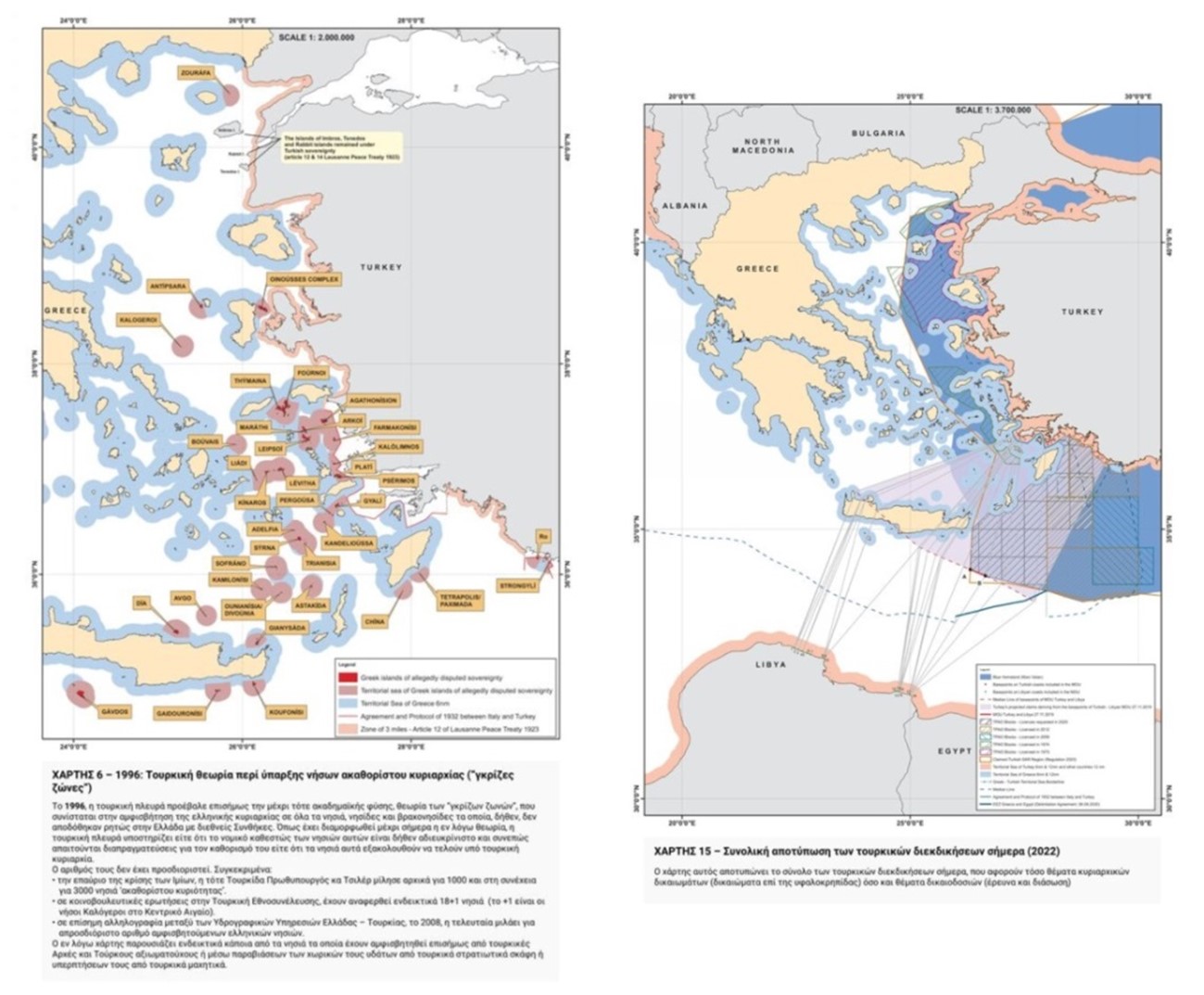 In the best-case-scenario for Turkey, even after international arbitration and according to the current territorial status quo, the Aegean Sea would probably remain a “Greek lake” because the interposition of hundreds of inhabited Greek Aegean islands could only allow for some local Turkish maritime re-entrants into the Aegean Archipelago, in a few sea areas beyond the Greek territorial waters. That’s why, quite recently, Turkey has also raised a sovereignty issue and question for all the islands belonging to its otherwise “NATO ally” Greece in the Eastern Aegean, extending from Samothraki down to Kastellorizo, whether small or large, uninhabited or inhabited, big islands or rocky islets. Turkey holds only trivial ground (islands and islets) to support and achieve an expansion of its maritime zones much deeper into the Aegean according to the established and still-in-force international treaties and conventions (the 1913 Bucharest Treaty, the 1914 London Convention, the 1923 Lausanne Treaty, and the 1947 Paris Treaty), so Turkish officials officially circulate the non-existent hypothesis of the supposedly “gray zones” of island sovereignty in the Aegean Archipelago. Thus, Turks intend to isolate and “neutralize”, or they threaten to use military force against the Greek islands of the Eastern Aegean so that their maritime zones may reach the desired depth according to their aspirations.