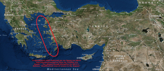 Consider for a moment the following paradox: the mutual defensive zone of NATO’s southeastern flank running through Greece and Turkey from the Turkish border in the Caucasus to the Greek islands in the Ionian Sea and almost at the “joining point” of this common defense area a misplaced “partial or complete demilitarized zone” existing from Samothraki in the north to the Dodecanese in the south! Does anyone honestly think this makes sense: the absurd notion of a “military vacuum” that disrupts the cohesion and tears apart the defense of the entire southeastern flank of NATO?