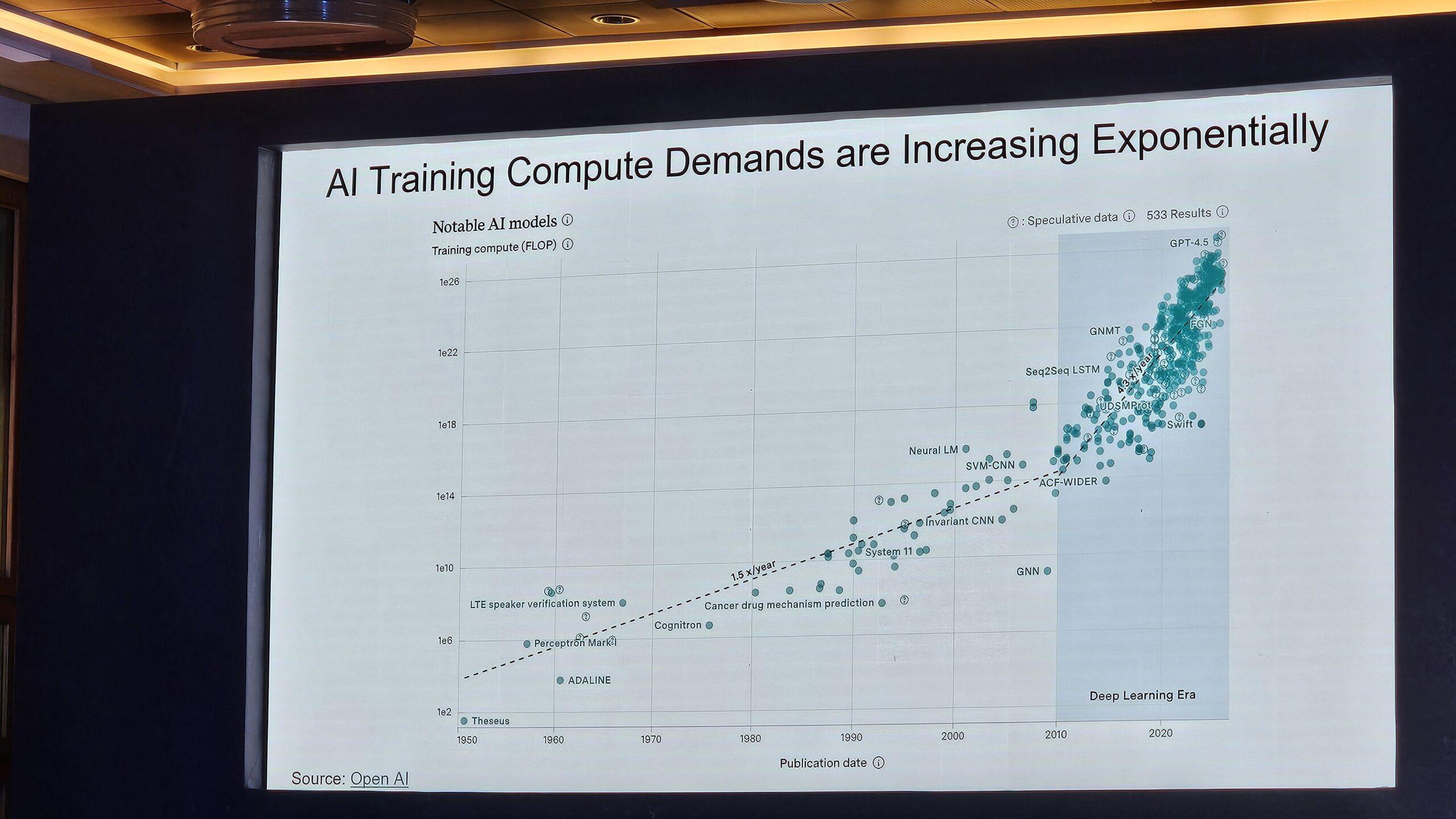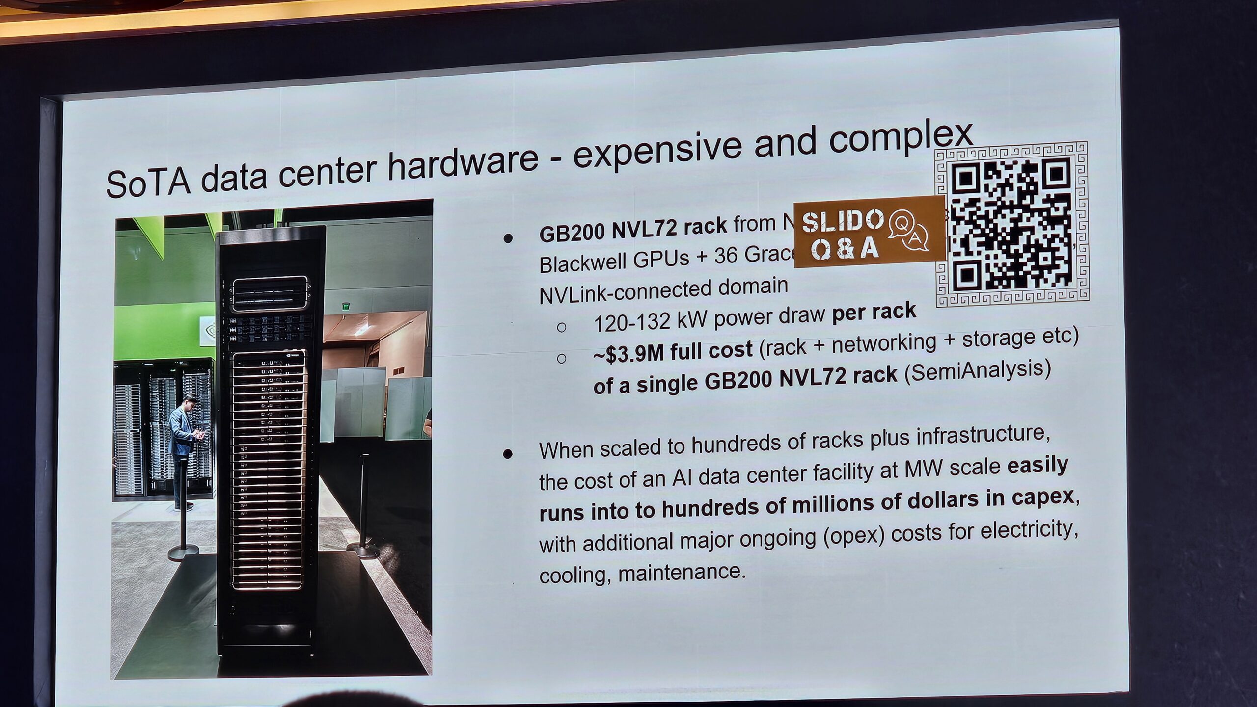 Έτσι από το 2012 έως το 2020, οι πόροι υπολογισμών για εκπαίδευση μοντέλων αυξήθηκαν κατά 10^6 φορές! Η διάλεξη εστίασε ιδιαίτερα στο υλικό: Οι επεξεργαστές γραφικών (GPU, Graphics Processing Units) της NVIDIA κυριαρχούν, με cluster όπως το DGX-1 να παρέχουν τεράστια αποθέματα υπολογιστικής ισχύος. Ως επιπλέον παράδειγμα αναφέρθηκε το NVIDIA A100 που είναι ιδανικό για βαθιά μάθηση (deep learning) και το H100, ως η επόμενη γενιά, με βελτιωμένη ενεργειακή απόδοση.