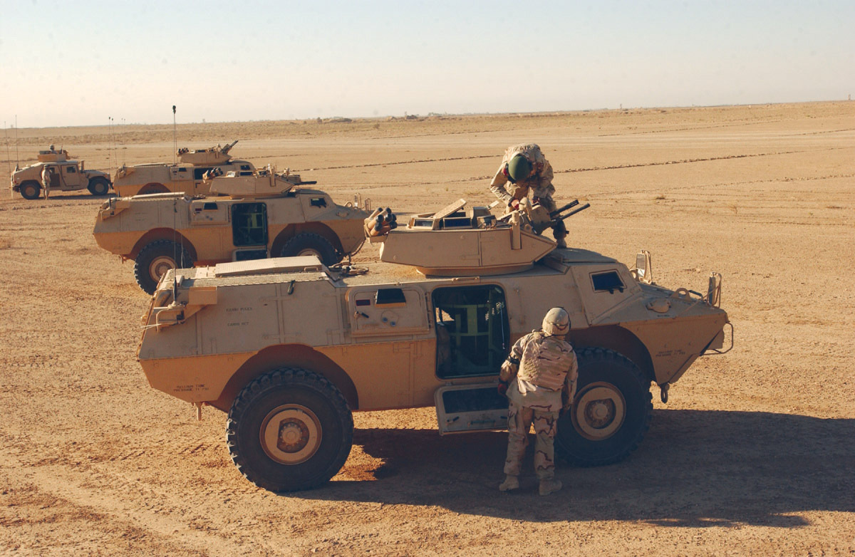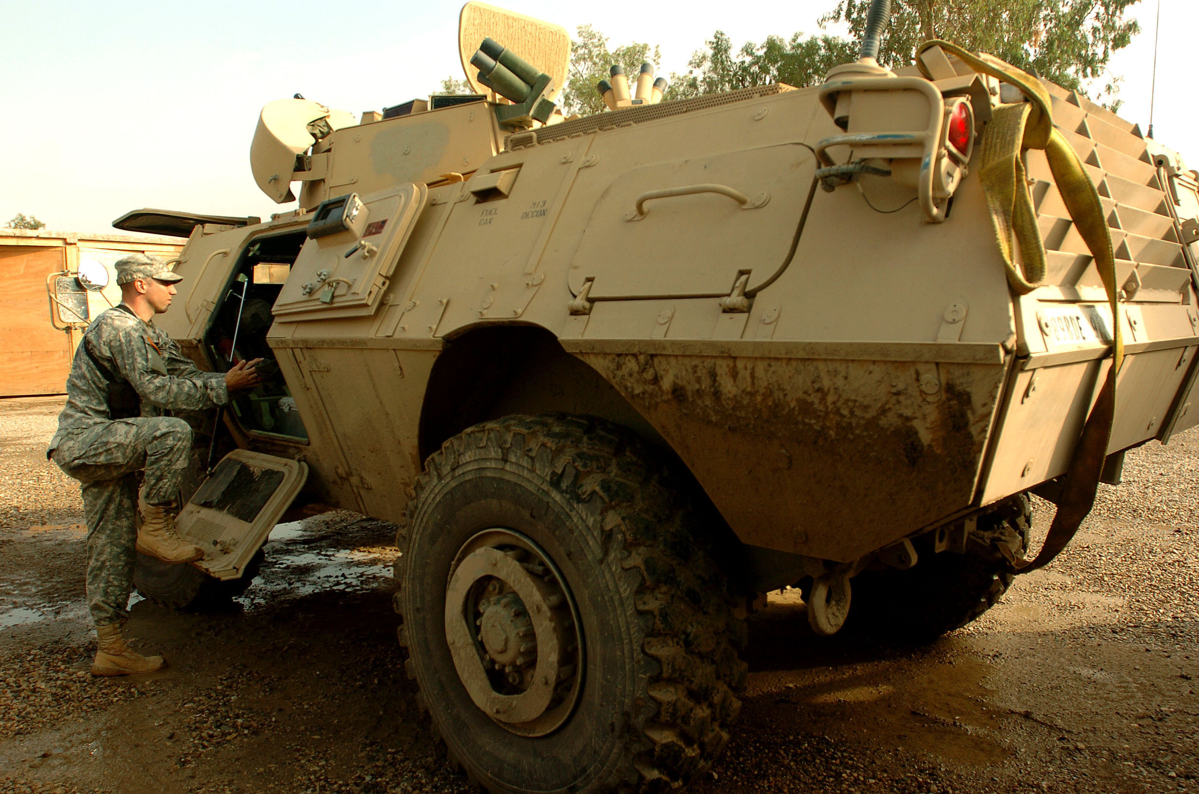 Spc. Eric Hawse, 549th Military Police Company out of Stewart, Ga., enters his M1117 Guradian ASV to perform preventive maintenace checks and services Nov. 2 at Foward Operating Base Marez in Mosul, Iraq. Visible are the inward sloped sides of the ASV.