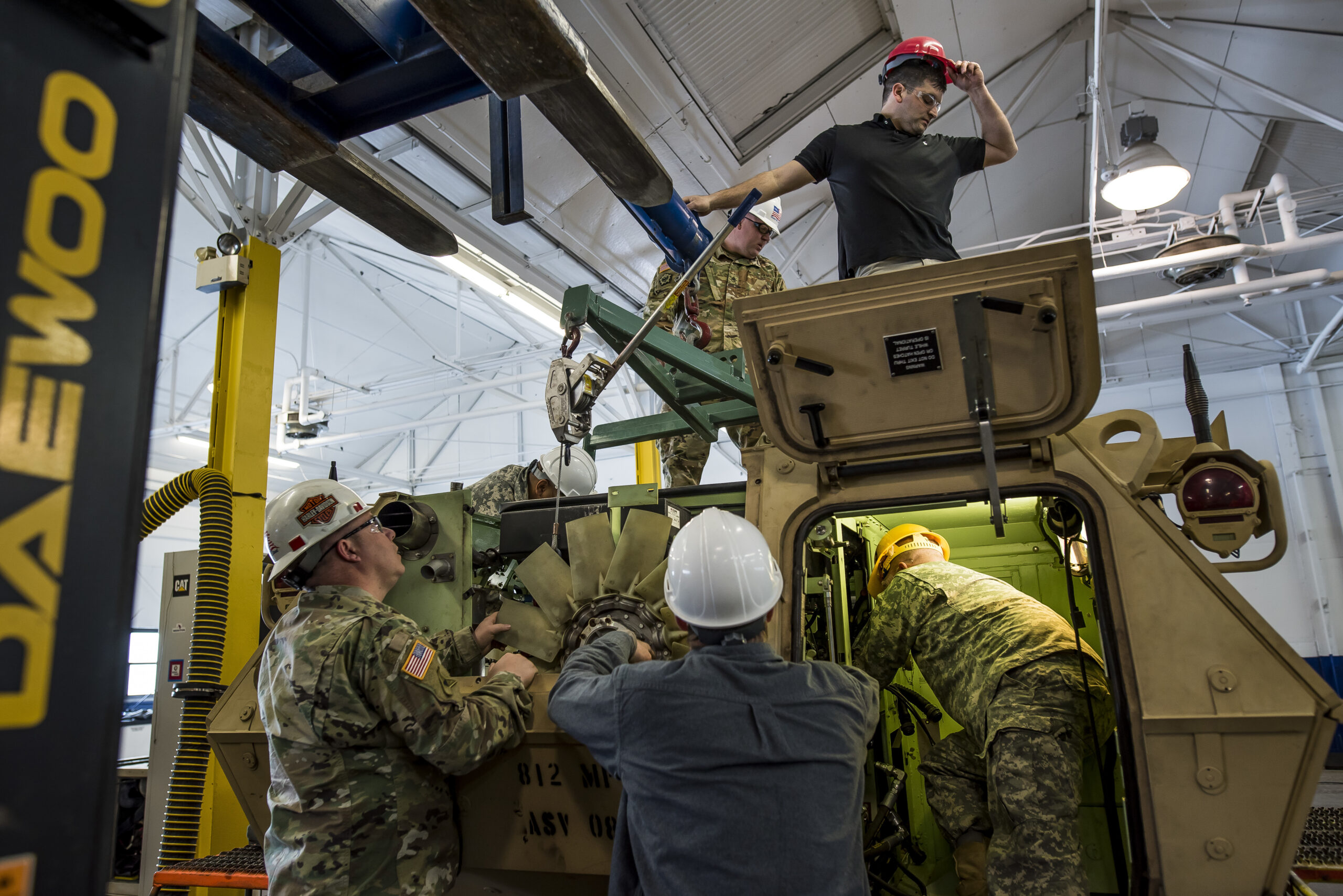 U.S. Army Reserve mechanics from across the 200th Military Police Command lower the engine pack into an M117 Armored Security Vehicle (ASV) during a maintenance course hosted by the 99th Readiness Division in Schenectady, New York, March 14, 2018. This is the first maintenance course in the U.S. Army Reserve designed specifically for the ASV, which has hydraulic components and maintenance procedures that are unlike most other Army vehicles. The ASV is designed to resist the impact of roadside bombs while operating in urban environments. Its mounting systems allow the ASV to hold an M2 .50-caliber machine gun, a MK-19 grenade launcher and an M249 Squad Automatic Weapon at the same time. (U.S. Army Reserve photo by Master Sgt. Michel Sauret)