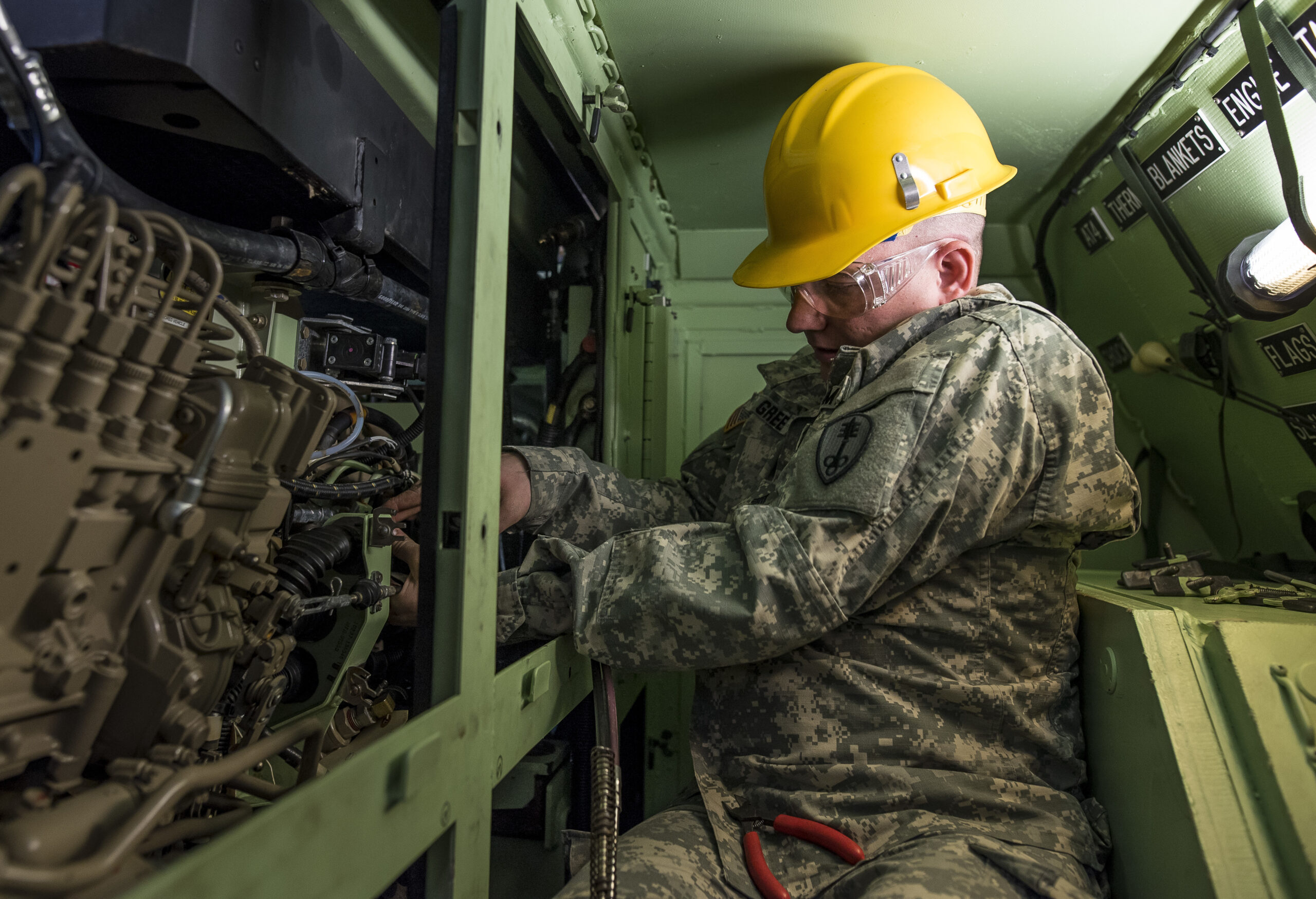 Sgt. Thomas Green, a U.S. Army Reserve mechanic with the 447th Military Police Company (Combat Support), out of North Canton, Ohio, works inside a small storage space to reattach lines to an entine on an M117 Armored Security Vehicle (ASV) during a maintenance course hosted by the 99th Readiness Division in Schenectady, New York, March 14, 2018. This is the first maintenance course in the U.S. Army Reserve designed specifically for the ASV, which has hydraulic components and maintenance procedures that are unlike most other Army vehicles. The ASV is designed to resist the impact of roadside bombs while operating in urban environments. Its mounting systems allow the ASV to hold an M2 .50-caliber machine gun, a MK-19 grenade launcher and an M249 Squad Automatic Weapon at the same time. (U.S. Army Reserve photo by Master Sgt. Michel Sauret)