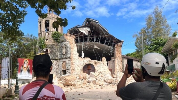 Βίντεο από κατοίκους που αναρτήθηκαν στα μέσα κοινωνικής δικτύωσης δείχνουν μια παλιά καθολική εκκλησία στη νήσο Μπανταγιάν, κοντά στην Σεμπού, να σείεται βίαια προτού καταρρεύσει το καμπαναριό της.