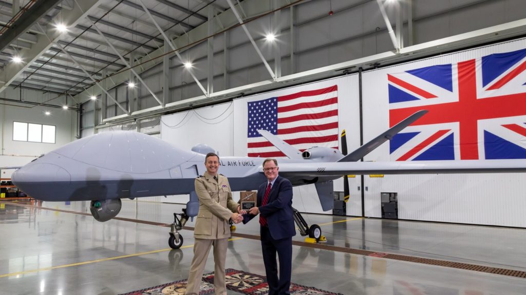 O υποπτέραρχος της βασιλικής πολεμικής αεροπορίας της Μ. Βρετανίας (RAF), Σίμον Έλλαρντ παρέλαβε εκ μέρους της χώρας του το πρώτο μη επανδρωμένο αεροσκάφος Protector RG Mk1 από την General Atomics Aeronautical Systems.