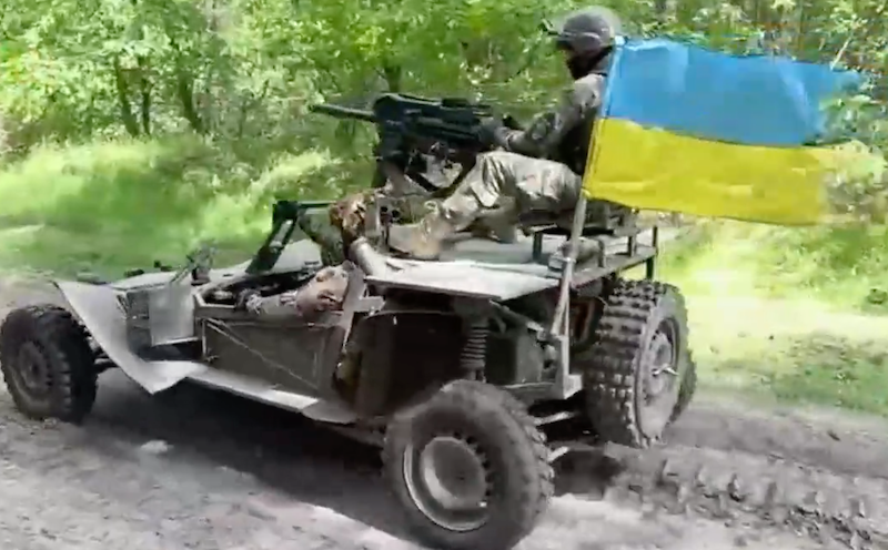 Εμπνευσμένο από τη σειρά ταινιών “Mad Max” φαίνεται ότι είναι το όχημα αναγνώρισης των ουκρανικών δυνάμεων, το οποίο εμφανίζεται σε βίντεο που δημοσίευσε στο Twitter o λογαριασμός του υπουργείου Άμυνας της Ουκρανίας. Πρόκειται για ένα όχημα παντός εδάφους τύπου buggy, στο οποίο οι Ουκρανοί έχουν προσθέσει ένα πίσω κάθισμα για τον πυροβολητή, ο οποίος χειρίζεται έναν αυτόματο εκτοξευτή βομβίδων.
