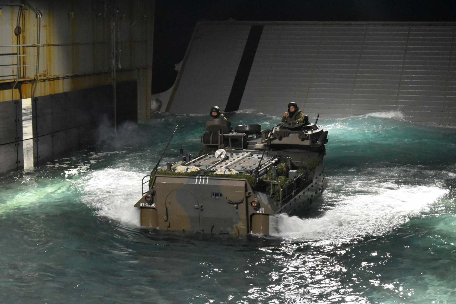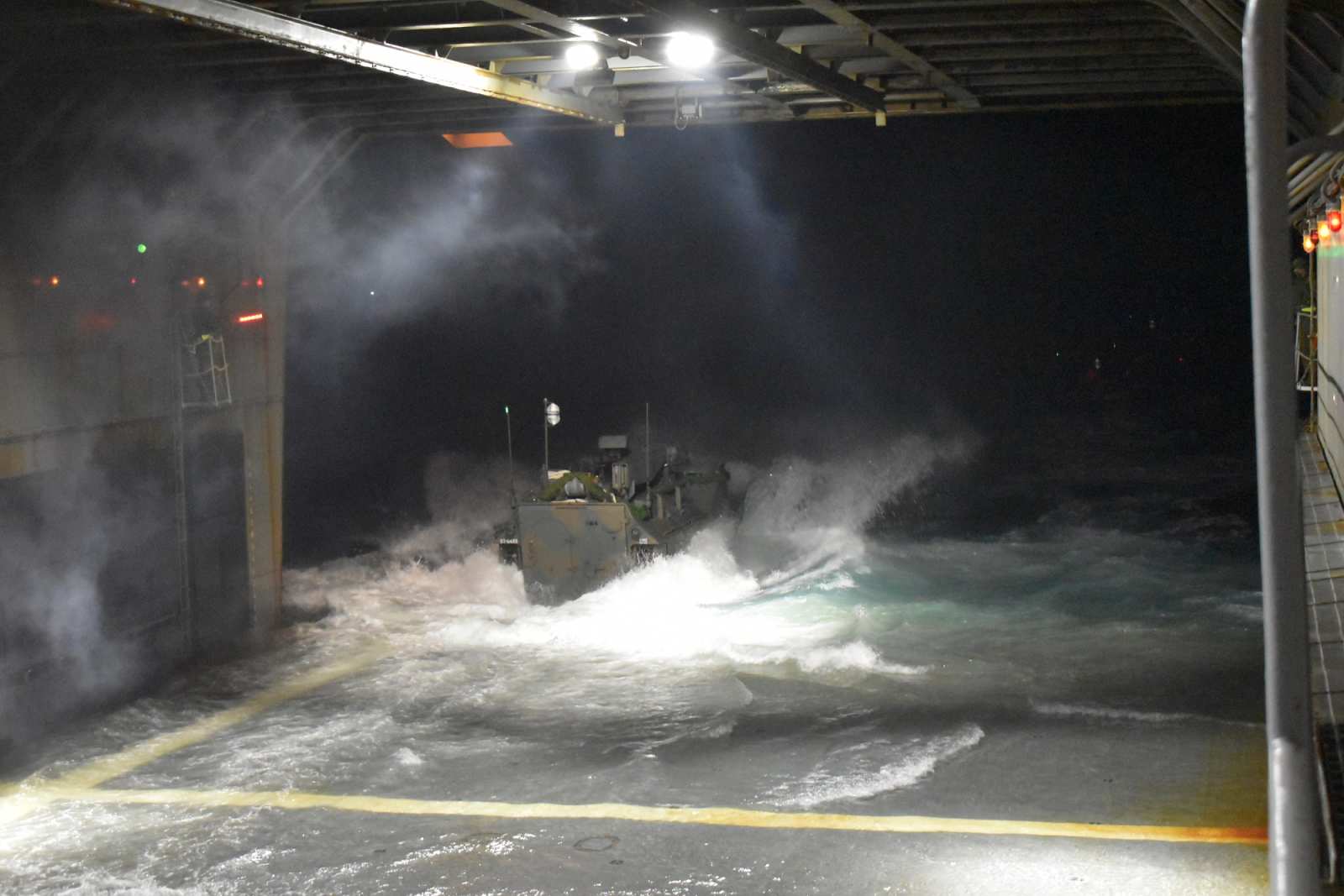 Από εδώ και πέρα, αρχίζει να γίνεται αντιληπτή η αξία των AAV-7, καθώς μπορούν να επιχειρήσουν και βράδυ. Στην παρακάτω φωτό ΑAV-7 ξεκινούν ως πρώτο αποβατικό κύμα, μέσα στο σκοτάδι, ενώ έντονος είναι ο παφλασμός από την “πτώση” ενός στο νερό.