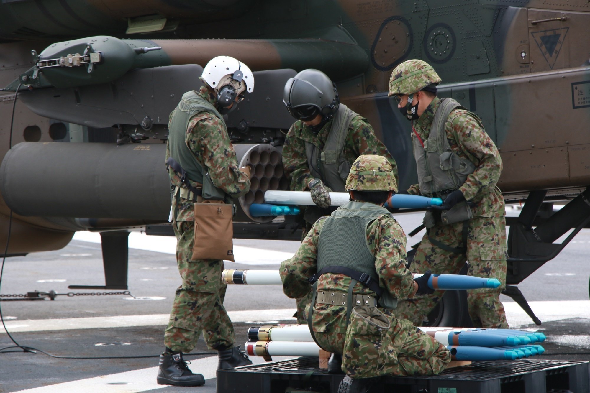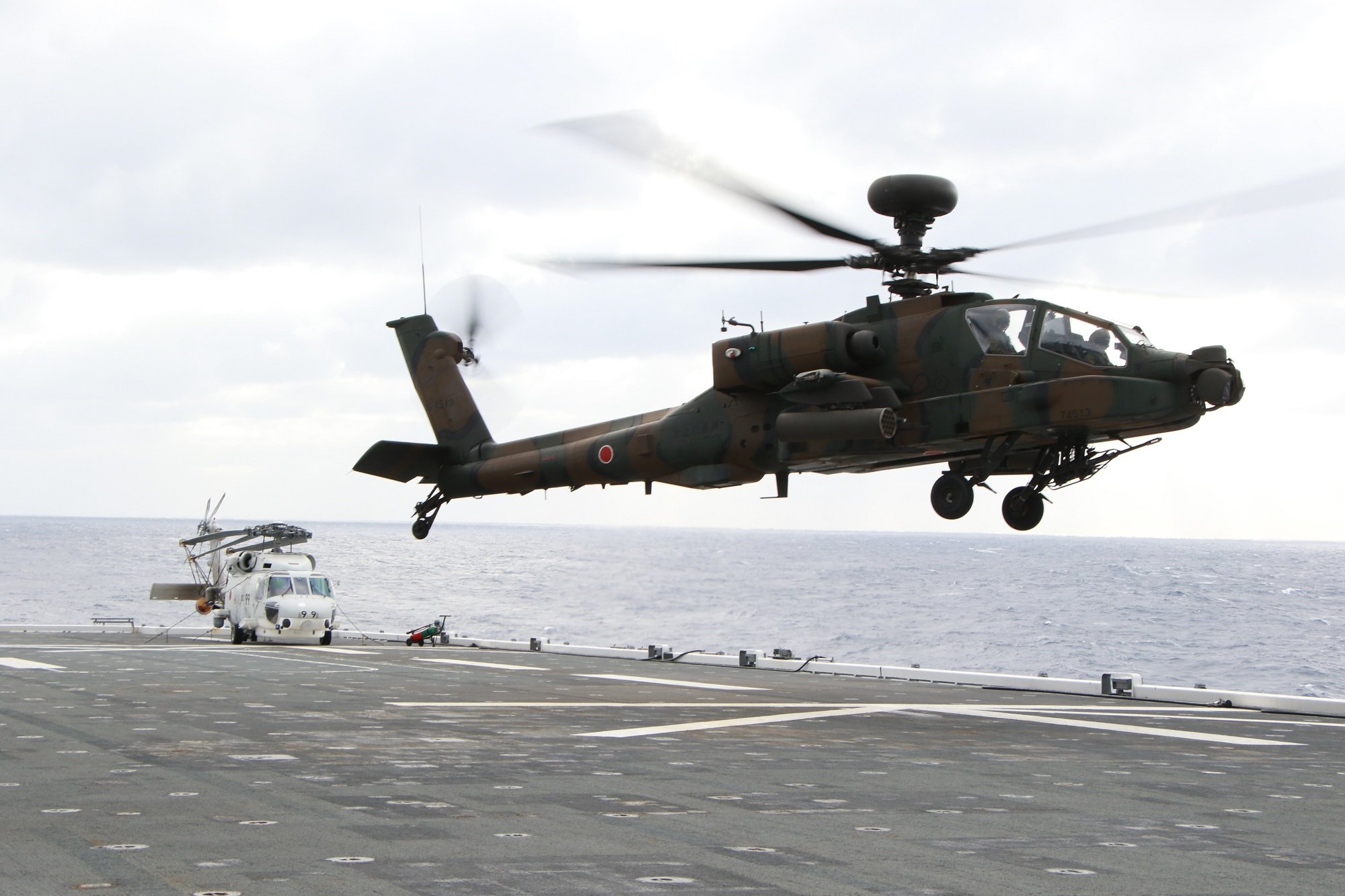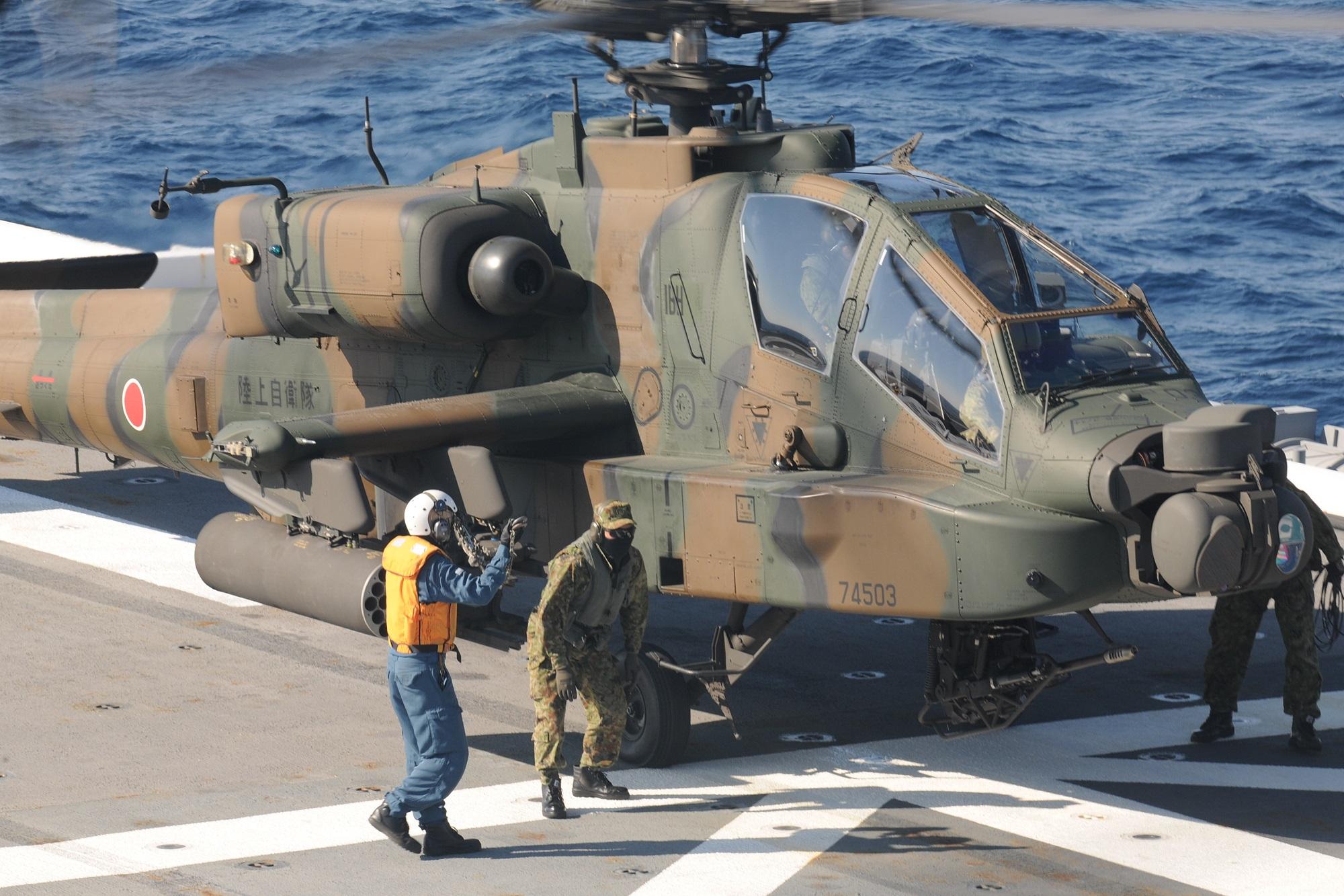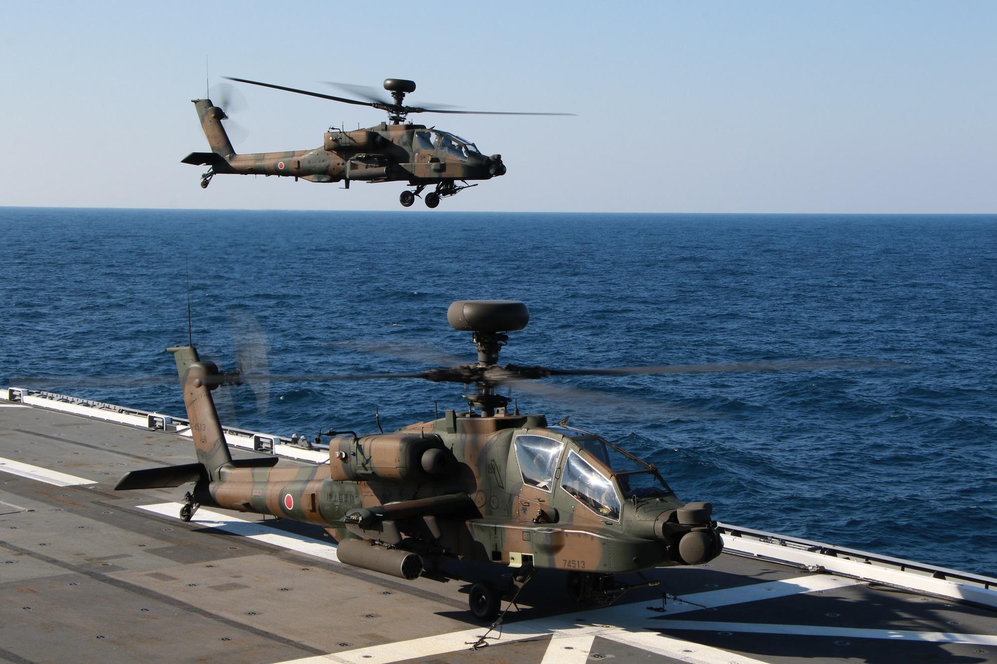Στη συνέχεια αναπόσπαστο κομμάτι της Αμφίβιας Δύναμης, είναι τα εναέρια μέσα. Οι Ιάπωνες διαθέτουν ελικοπτεροφόρα, από τα οποία θα επιχειρήσουν τα AH-64D. Παρατηρούμε εδώς πως παρά το γεγονός ότι η Ιαπωνία είναι νησιωτική χώρα, δεν επέλεξε το “ναυτικό” ελικόπτερο AH-1W (όπως έκαναν οι Αμερικανοί Πεζοναύτες) αλλά το “χερσαίο” και βαρύτερο AH-64D. Αν μη τι άλλο, είναι μια επιβεβαίωση της επιλογής που έκανε πριν από 30 χρόνια κι ο Ελληνικός Στρατός.