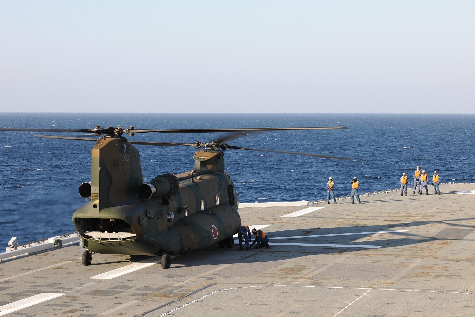 H Ιαπωνία για αερομεταφορά κάνει χρήση των CH-47JA (θα λέγαμε πως είναι ένα “πρώιμο” CH-47D) και για όλες τις παρεμφερείς αποστολές, ανεφοδιασμό, διείσδυση κ.ο.κ. Αν σας θυμίζει κάτι η παρακάτω ιαπωνική εικόνα, είναι παρόμοια εκείνης των ελληνικών CH-47DG πάνω σε αιγυπτιακά ελικοπτεροφόρα.